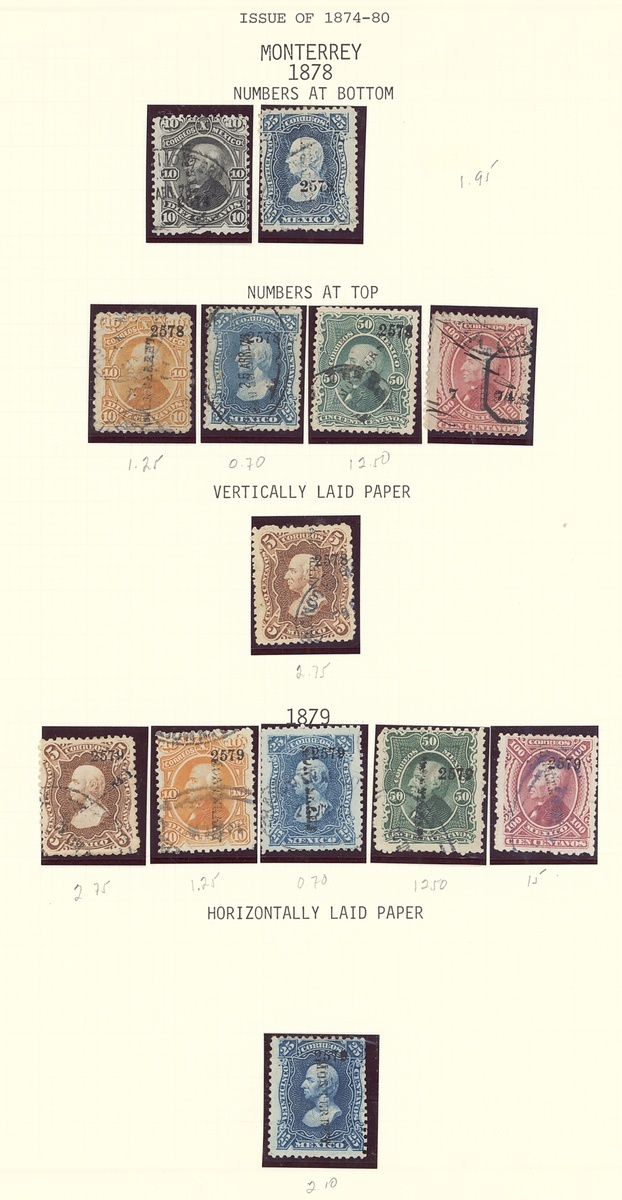 Various Districts 1874, 4c. to 100c., an assembly comprising 219 stamps, both used and unused, from the Monterrey, Tuxpan, and Mexico districts, along with 17 covers featuring single domestic usages of the 10c. and 25c. denominations. This collection includes 32 stamps of the 100c. denomination and 27 stamps of the 50c. denomination, all mounted on album pages by year and issue. The overall condition is good., ,