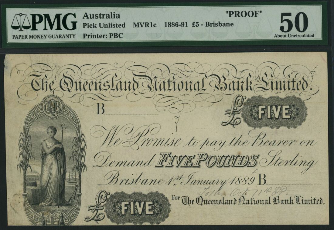 (x) Queensland National Bank Limited, Australia, proof £5, Brisbane, 1st January 1889, (Pick unlisted, MVR1c), in PMG holder 50 About Uncirculated, printer's annotations