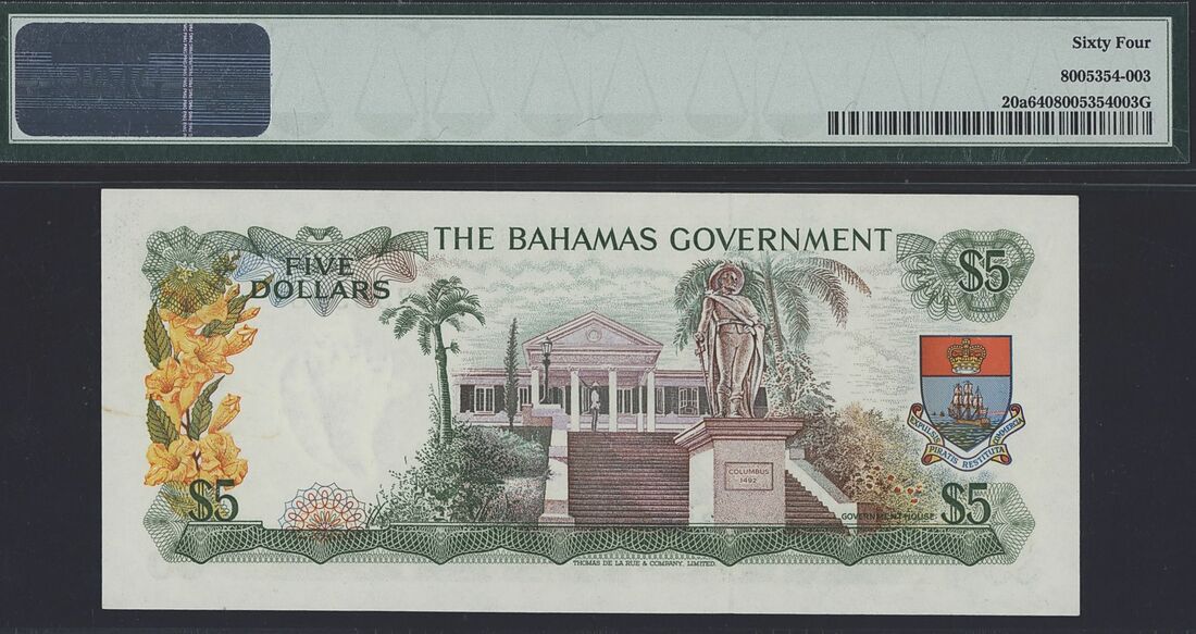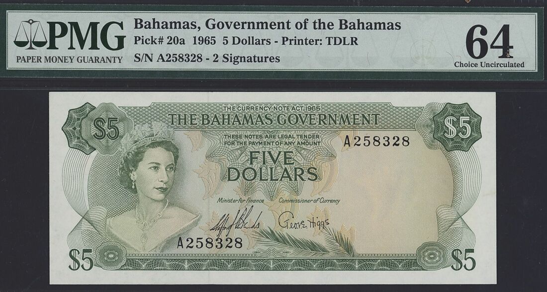 (x) The Bahamas Government, 5 Dollars, 1965, serial number A258328, (Pick 20a), in PMG holder 64 Choice Uncirculated
