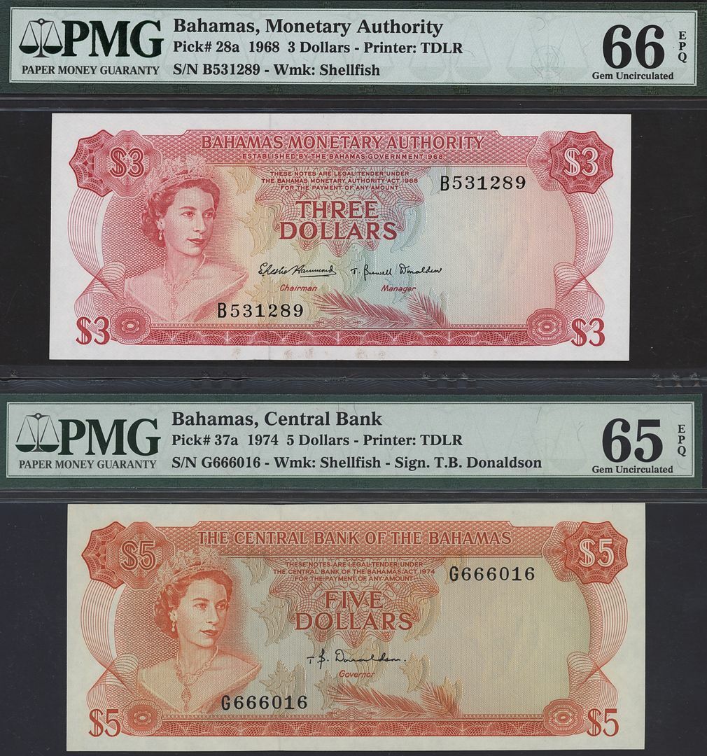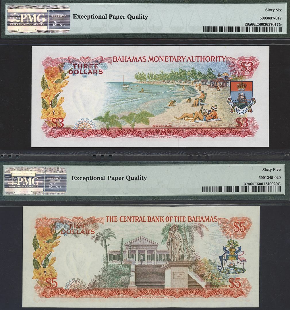 (x) Bahamas Monetary Authority, Central Bank of the Bahamas, [2 notes] 3, 5 Dollars, 1968-1974, serial numbers B531289 and G666016, (Pick 28a, 37a), in PMG holders 65 EPQ Gem Uncirculated and 66 EPQ Gem Uncirculated (2 notes)
