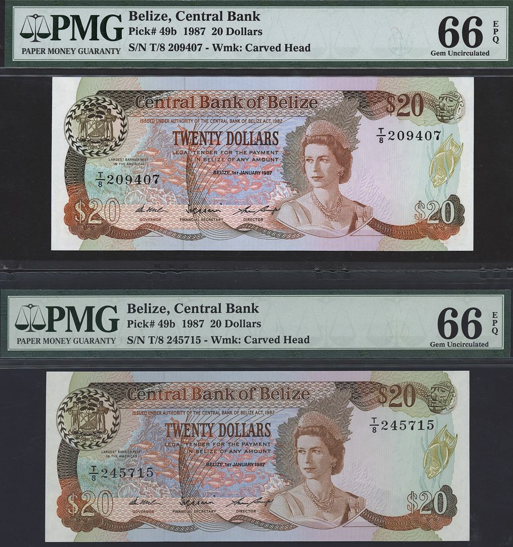 (x) Central Bank of Belize, [2 notes] 20 Dollars, 1st January 1987, serial numbers T/8 209407 and T/8 245715, (Pick 49b), both in PMG holder 66 EPQ Gem Uncirculated (2 notes)