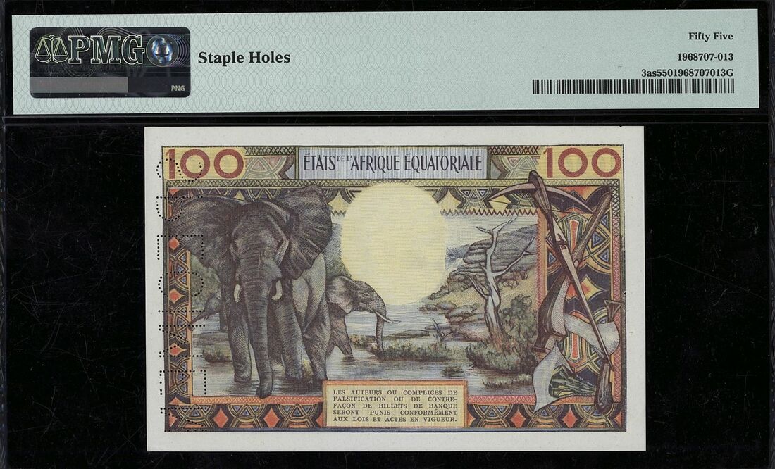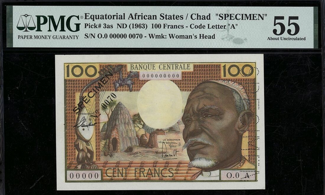(x) Banque Centrale, Chad, Equatorial African States, specimen, 100 Francs, ND (1963), serial number O.0 A 00000 0070, (Pick 3as, BNB 201), in PMG holder 55 About Uncirculated, staple holes