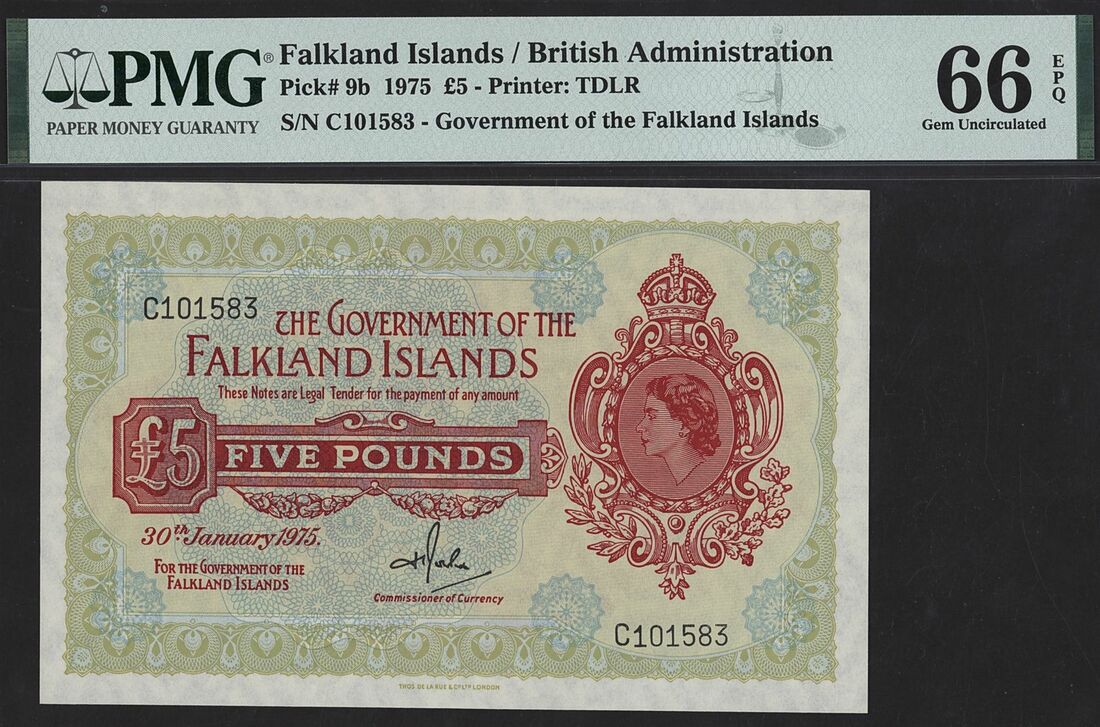 (x) Government of the Falkland Islands, £5, 30th January 1975, serial number C101583, (Pick 9b), in PMG holder 66 EPQ Gem Uncirculated