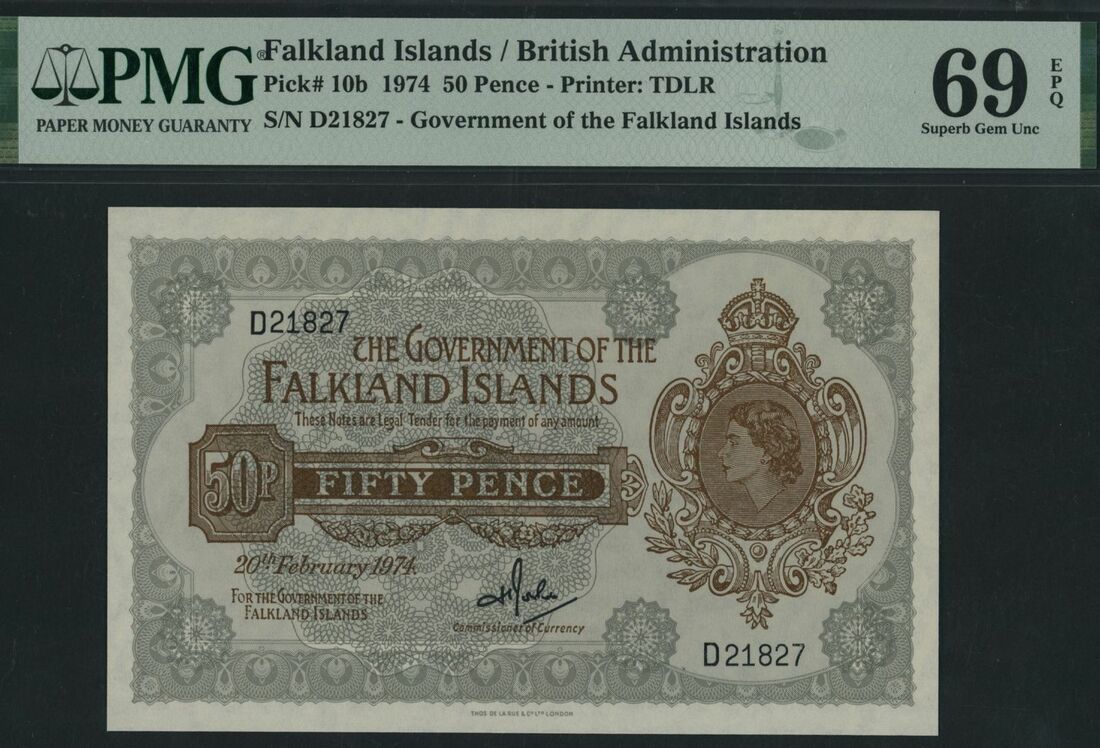 (x) Government of the Falkland Islands, [Top Pop] 50 Pence, 20th February 1974, serial number D21827, (Pick 10b), in PMG holder 69 EPQ Superb Gem Uncirculated, single finest graded on PMG census