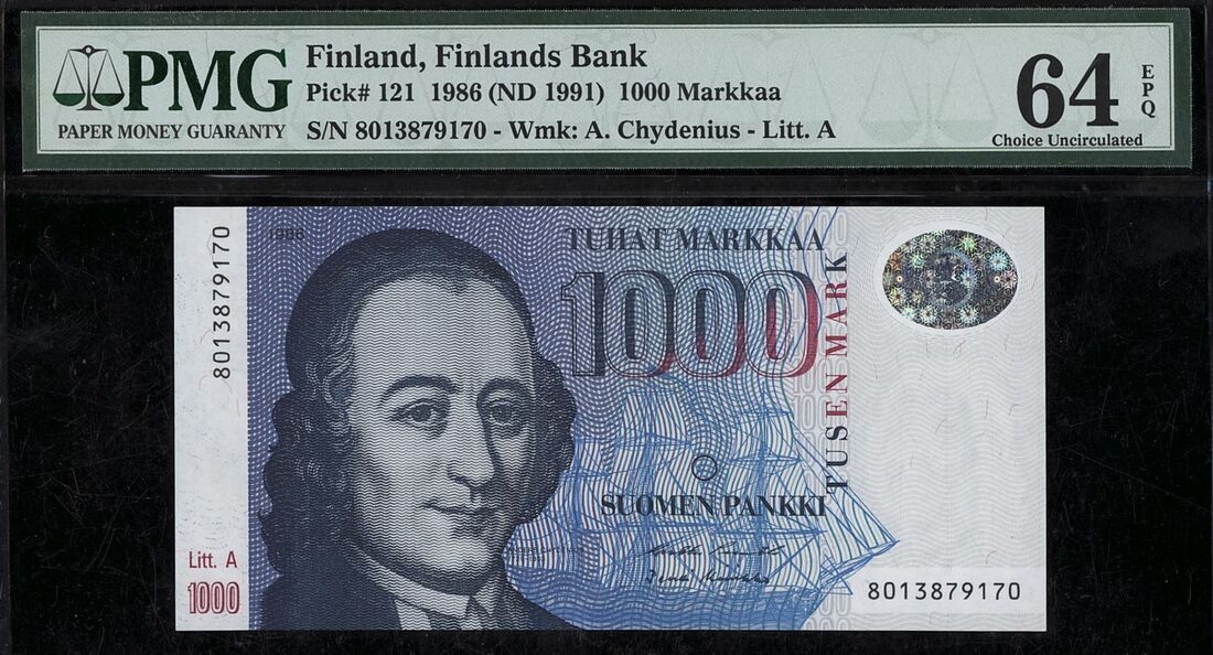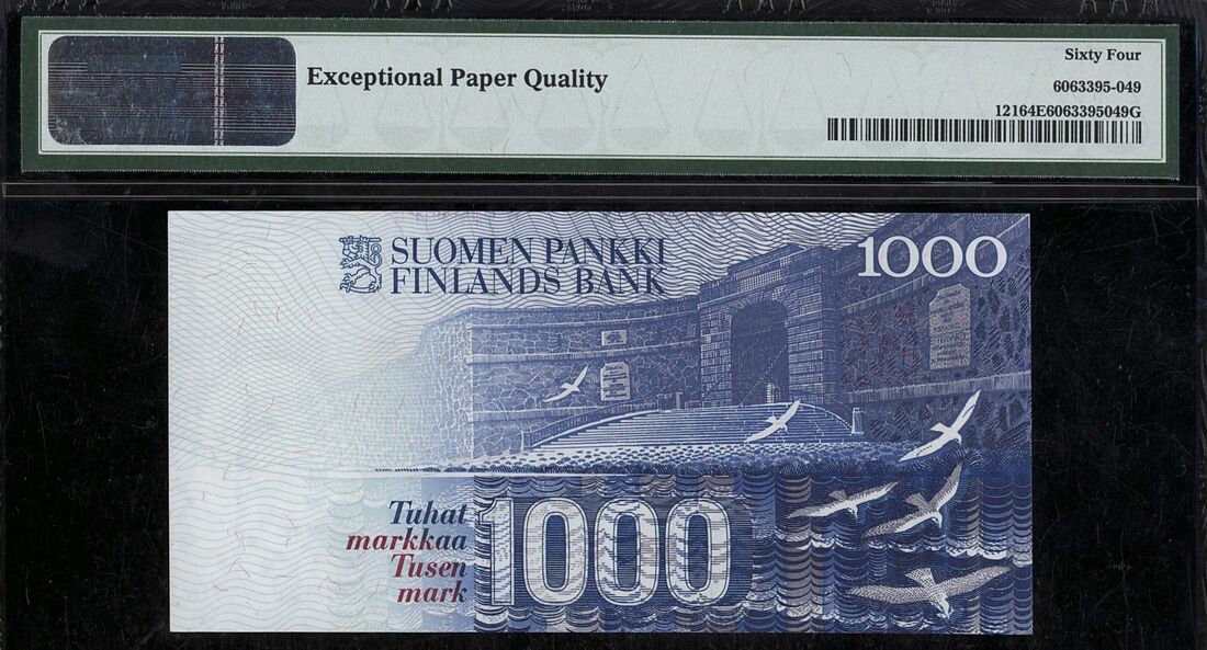 (x) Finlands Bank, Finland, 1000 Markkaa, 1986 (ND 1991), serial number 8013879170, (Pick 121, BNB 406), in PMG holder 64 EPQ Choice Uncirculated