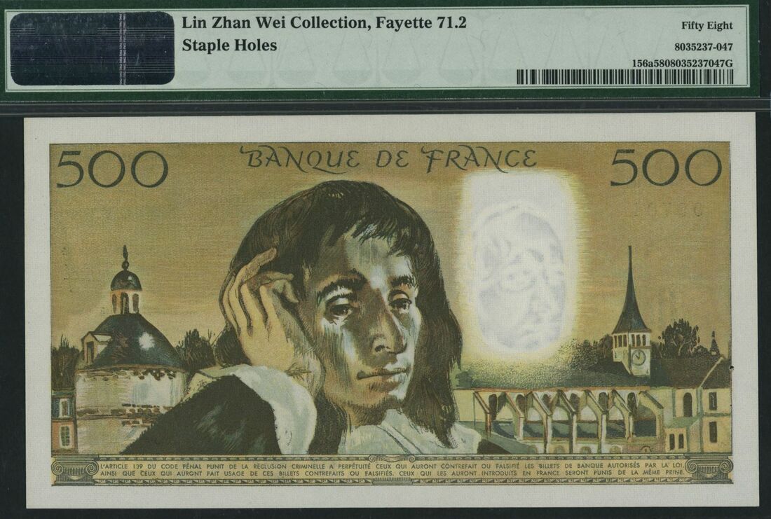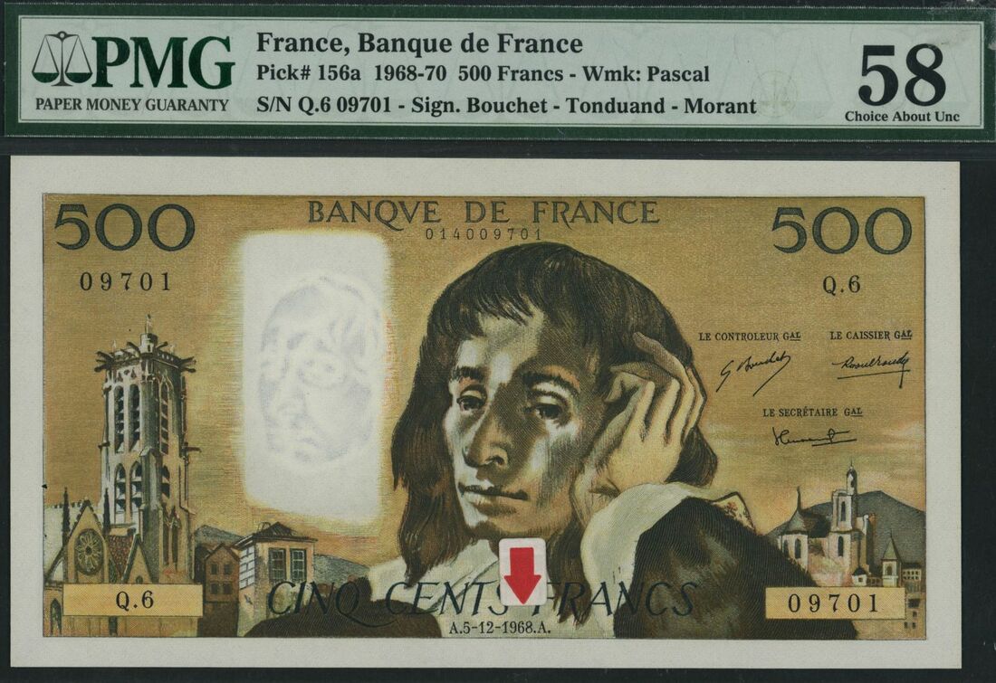 (x) Banque de France, 500 Francs, 5th December 1968, serial number Q.6 09701, (Pick 156a, Fayette 71.2), in PMG holder 58 Choice About Uncirculated, ex Lin Zhan Wei Collection, staple holes