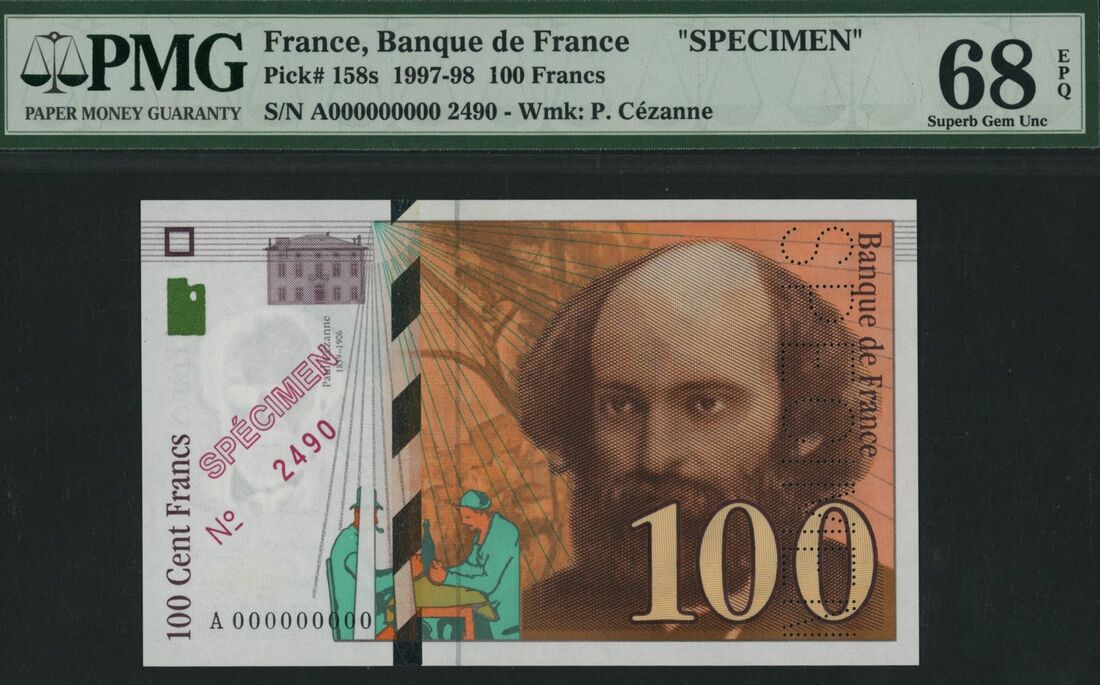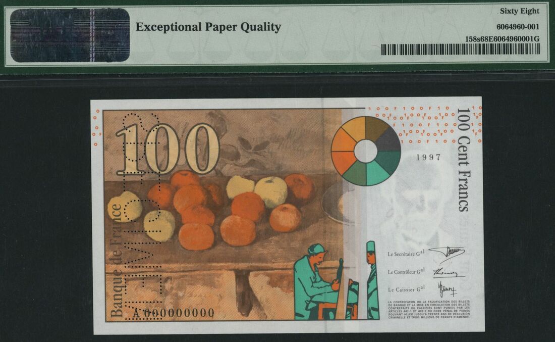 (x) Banque de France, [Top Pop] specimen, 100 Francs, 1997, serial number A000000000 2490, (Pick 158s), in PMG holder 68 EPQ Superb Gem Uncirculated, single finest graded on PMG census