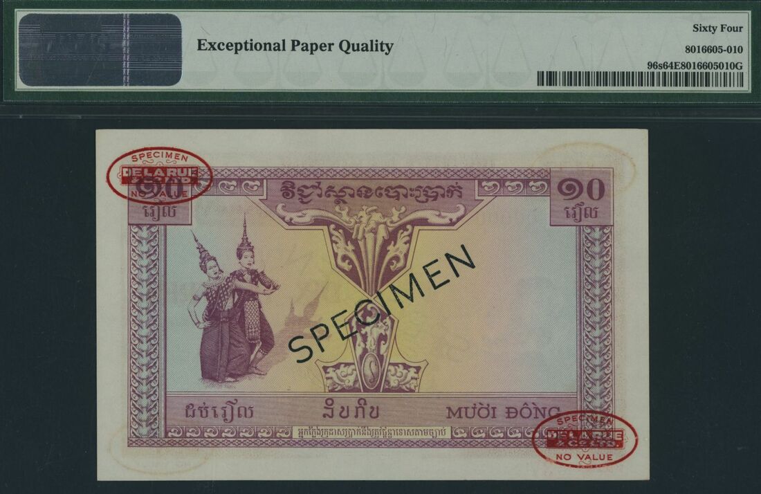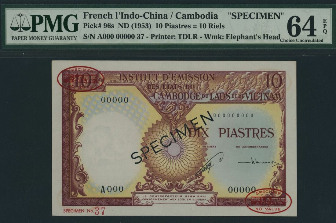 (x) Institut d´Emission des Etats du Cambodge, du Laos et du Vietnam, French Indo-China, specimen 10 Piastres, ND (1953), serial number A000 00000 37, (Pick 96s), in PMG holder 64 EPQ Choice Uncirculated