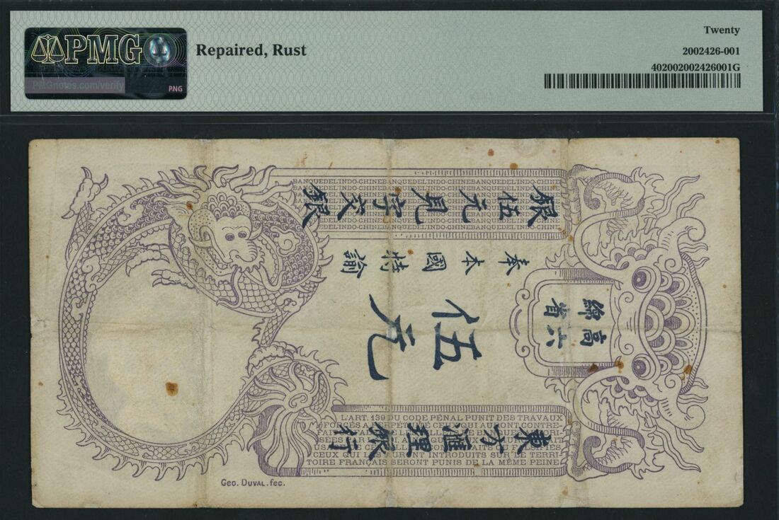(x) Banque de l'Indo-Chine, French Indo-China, 5 Piastres, Saïgon, 3rd February 1920, serial number E.198 394, (Pick 40), in PMG holder 20 Very Fine, repaired, rust