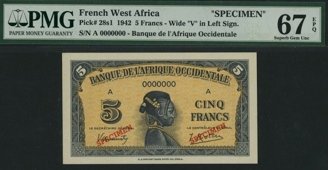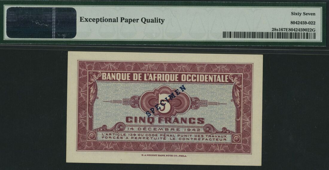 (x) Banque de l'Afrique Occidentale, French West Africa, [Top Pop] 5 Francs, 14th December 1942, serial number A 0000000, wide ""V"" in left signature