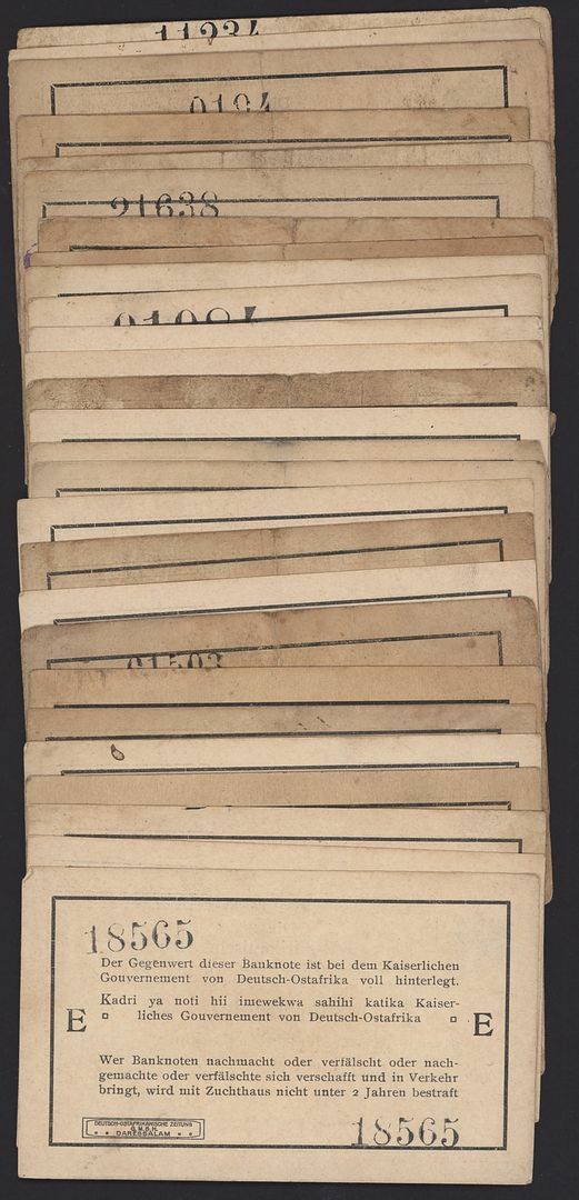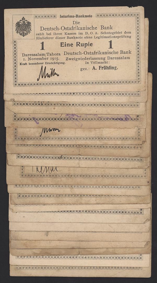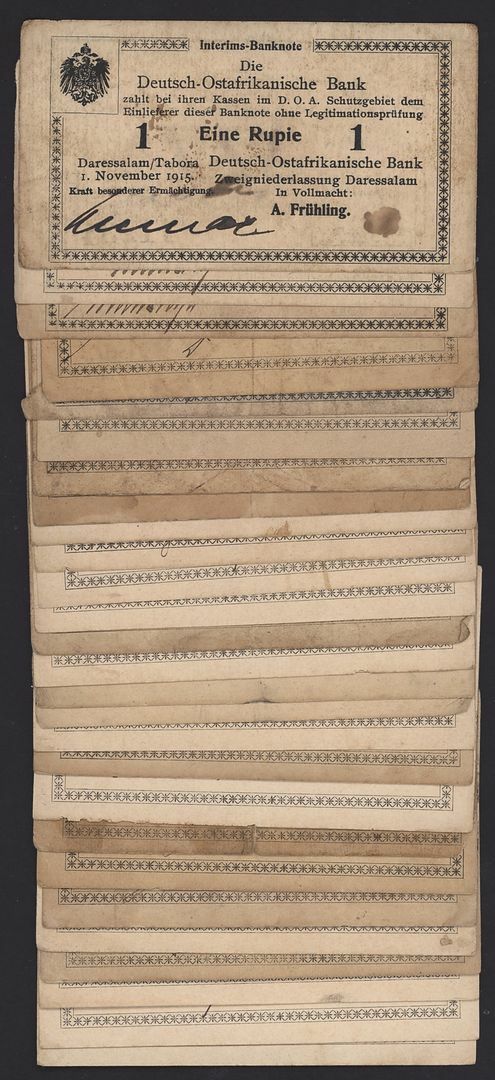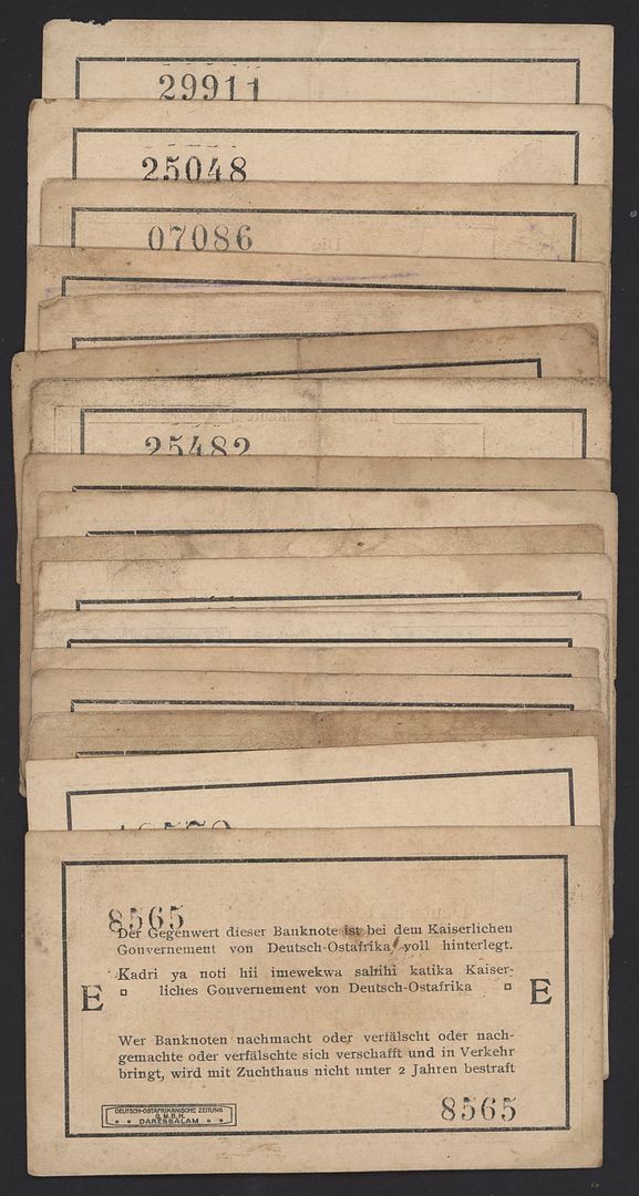 Deutsch-Ostafrikanische Bank, German East Africa, [45 notes] 1 Rupie, 1st November 1915, 1st December 1915, includes three Pick 12c notes, which have a meander stripe watermark, rare