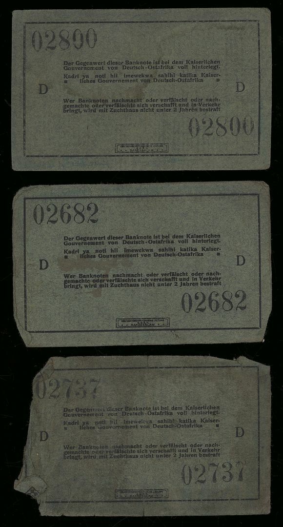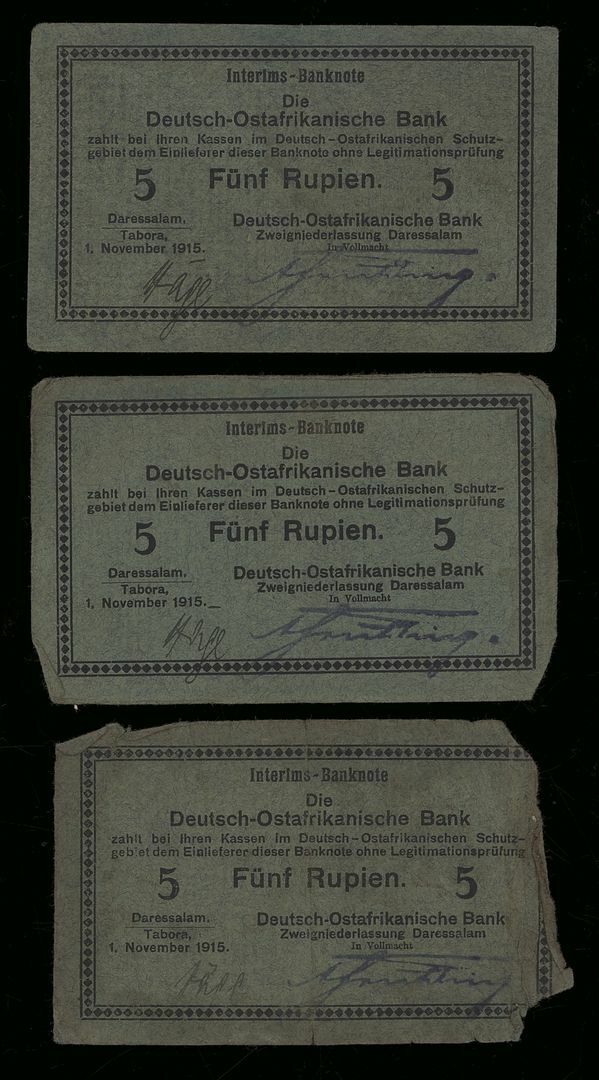 Deutsch-Ostafrikanische Bank, German East Africa, [3 notes] 5 Rupien, 1st November 1915, serial numbers 02682, 02737 and 02800, Daressalam/Tabora in 2 lines