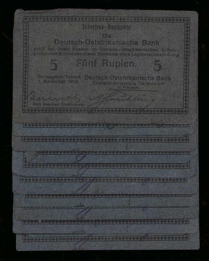 Deutsch-Ostafrikanische Bank, German East Africa, [10 notes] 5 Rupien, 1st November 1915, serial numbers 7445, 15941, 80625, 80641, 80721, 80722, 80723, 83054, 83066, and 85958