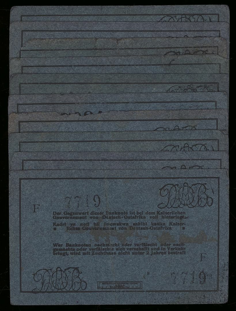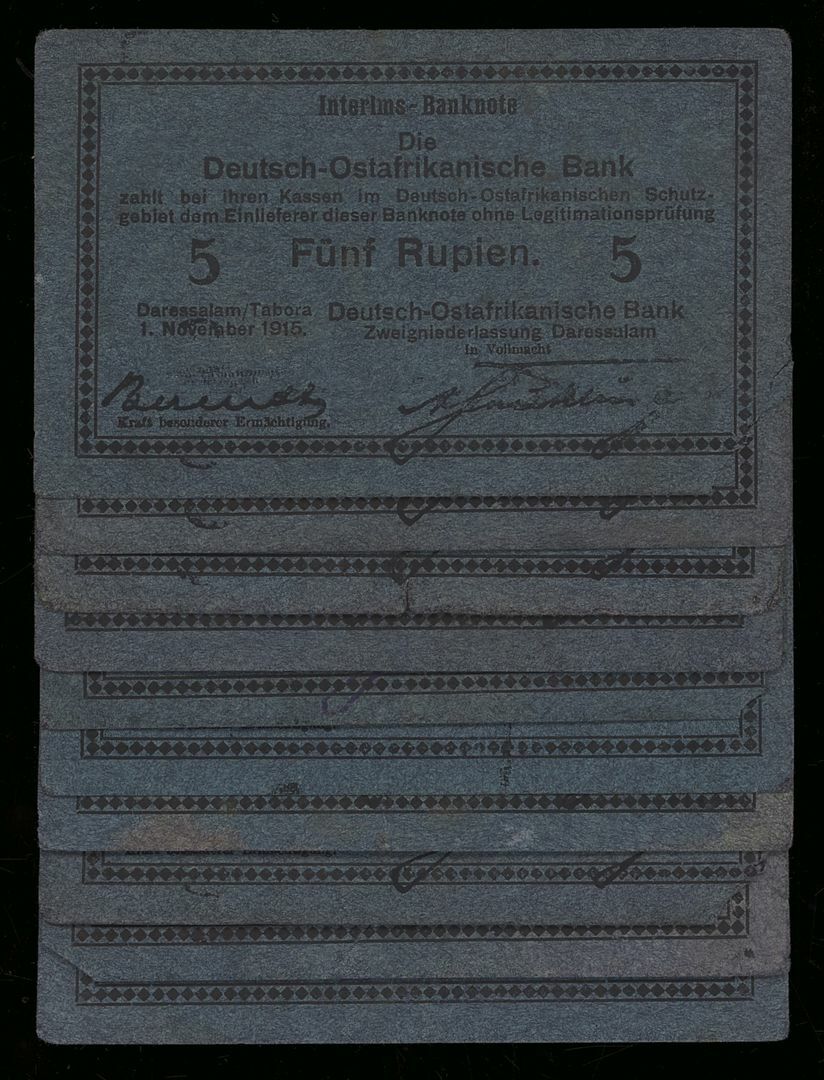 Deutsch-Ostafrikanische Bank, German East Africa, [10 notes] 5 Rupien, 1st November 1915, serial numbers 7719, 07031, 1412614461, 80785, 96169, 97519, 97520, 9752197677,