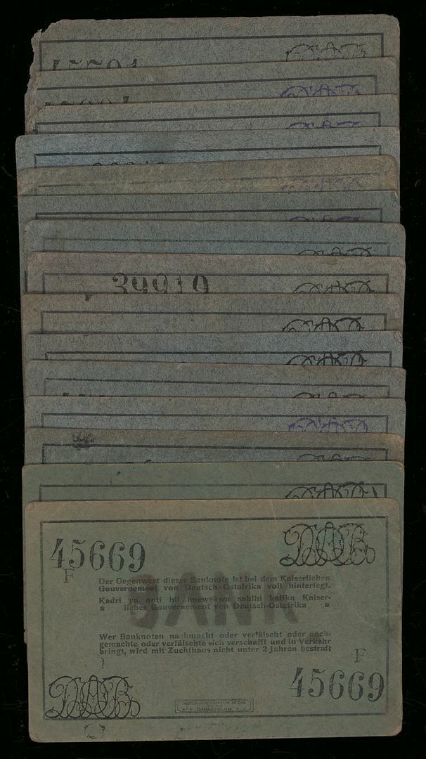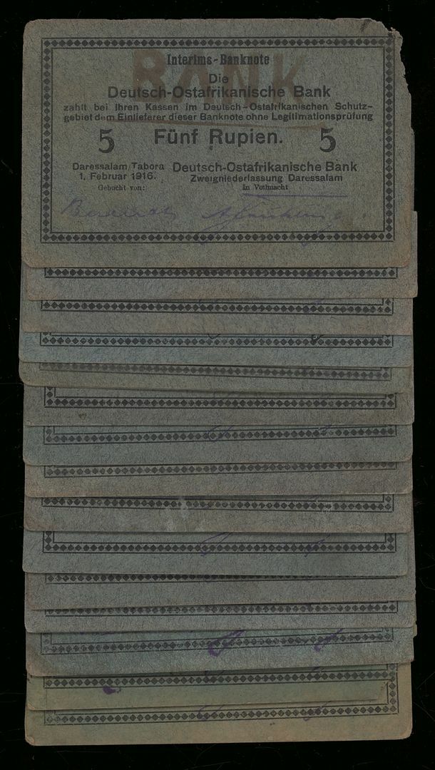 Deutsch-Ostafrikanische Bank, German East Africa, [15 notes] 5 Rupien, 1st February 1916, stiff grey-blue cardboard and green cardboard, (Pick 36a, 36d), very good, paper loss, to very fine (15 notes)