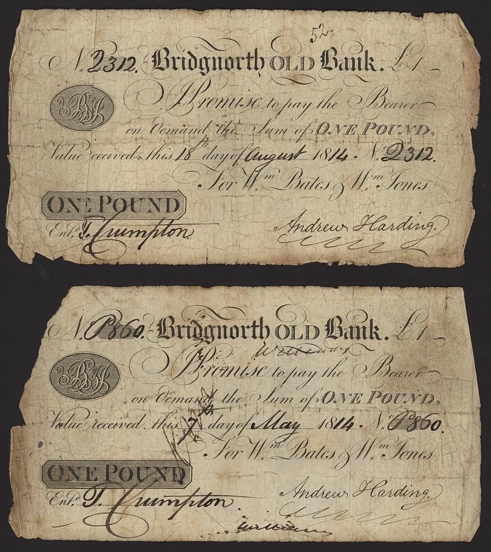 Bridgnorth Old Bank, [3 notes] £1, 1813-14, all hand signed, serial numbers 0199, 0860, and 2312, some handwriting on the reverse of all notes