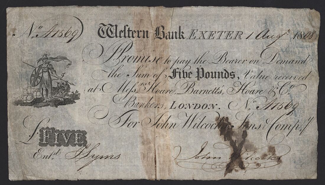 Weston Bank, Exeter, £5, 1st August 1808, serial number A1569, 'John Wilcocks, Sons and Company', issued note however the denomination is currently unlisted in Outing