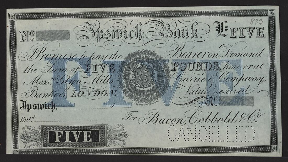 Ipswich Bank, cancelled unissued £5, 1xxx (ND 1877-1885), for Bacon, Cobbold & Co., cancelled perforation