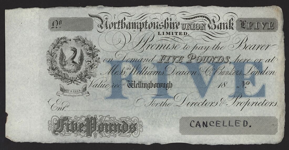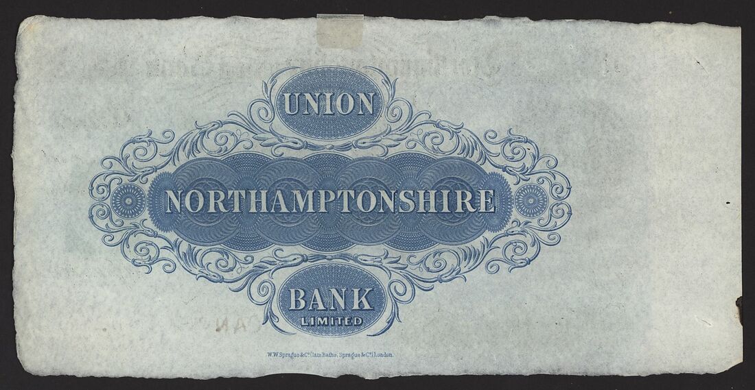 Northamptonshire Union Bank Limited, cancelled unissued £5, Wellingborough, 18xx (ND 1880-1920), "cancelled" written in ink