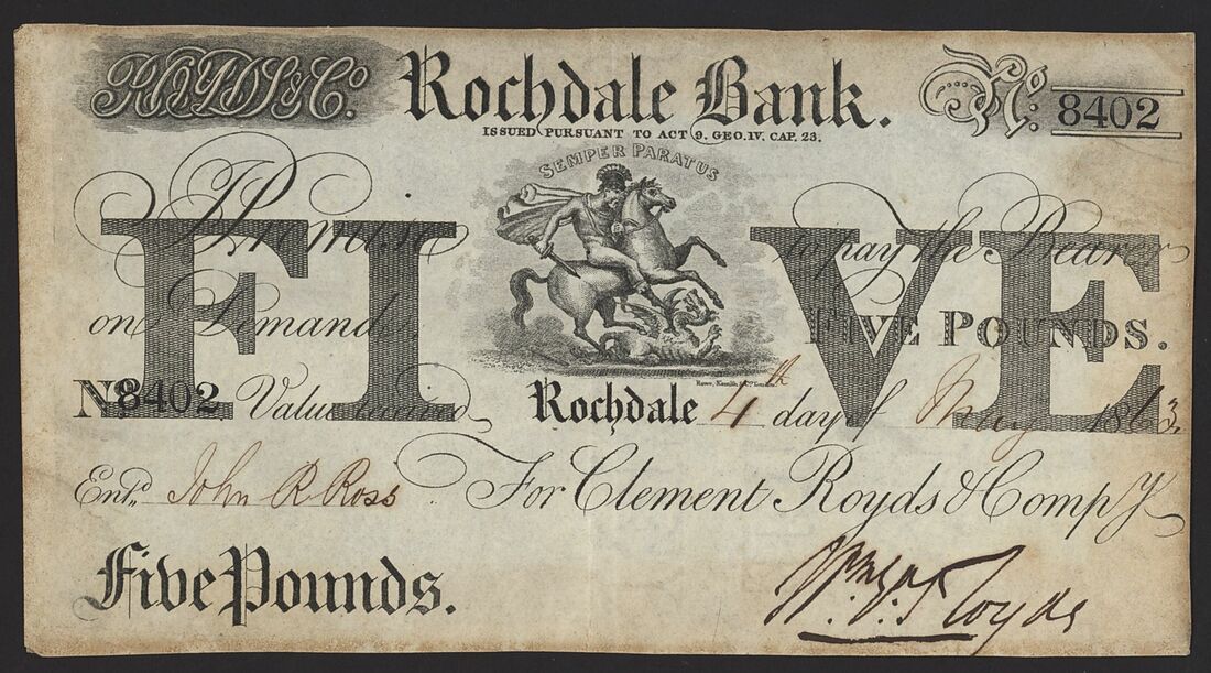 Rochdale Bank, £5, 4th May 1863, serial number 8402, (Outing 1807), very fine, pinholes and heavy discolouration
