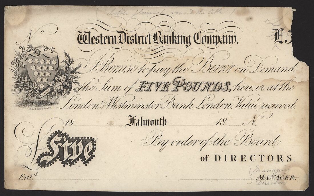 Western District Banking Company, obverse proof £5, Falmouth, 18xx, unrecorded bank