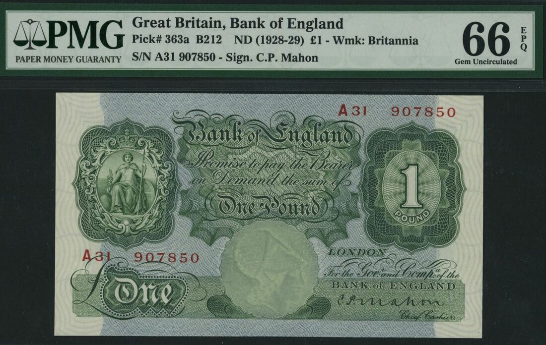 (x) Bank of England, £1, ND (1928-29), serial number A31 907850, C.P. Mahon signature, (Pick 363a, EPM B212), in PMG holder 66 EPQ Gem Uncirculated, only 5 notes graded higher on PMG census