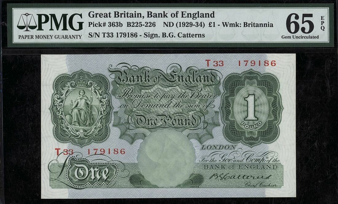 (x) Bank of England, £1, ND (1929-34), serial number T33 179186, B.G. Catterns signature, (Pick 363b, EPM B225-226), in PMG holder 65 EPQ Gem Uncirculated