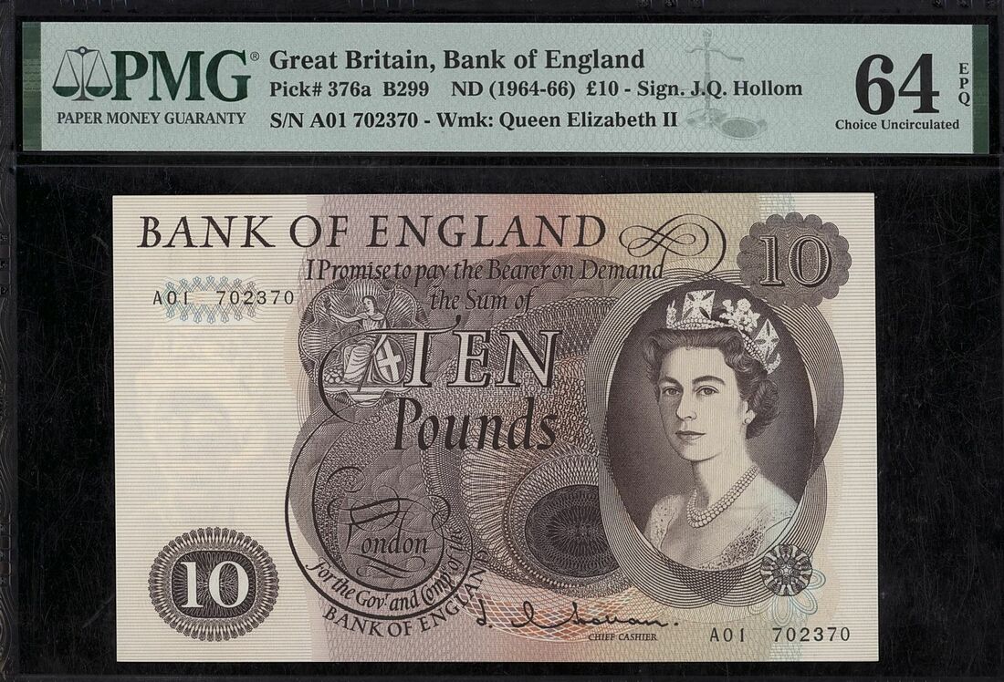 Bank of England, £10, ND (1964-66), serial number A01 702370, J.Q. Hollom signature, (Pick 376a, EPM B299), in PMG holder 64 EPQ Choice Uncirculated