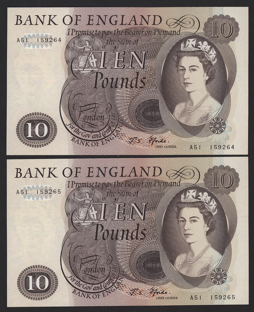(x) Bank of England, £10, ND (1967), serial number A51 159264, 65, J. S. Fforde signature, (EPM B316), uncirculated (2 notes)