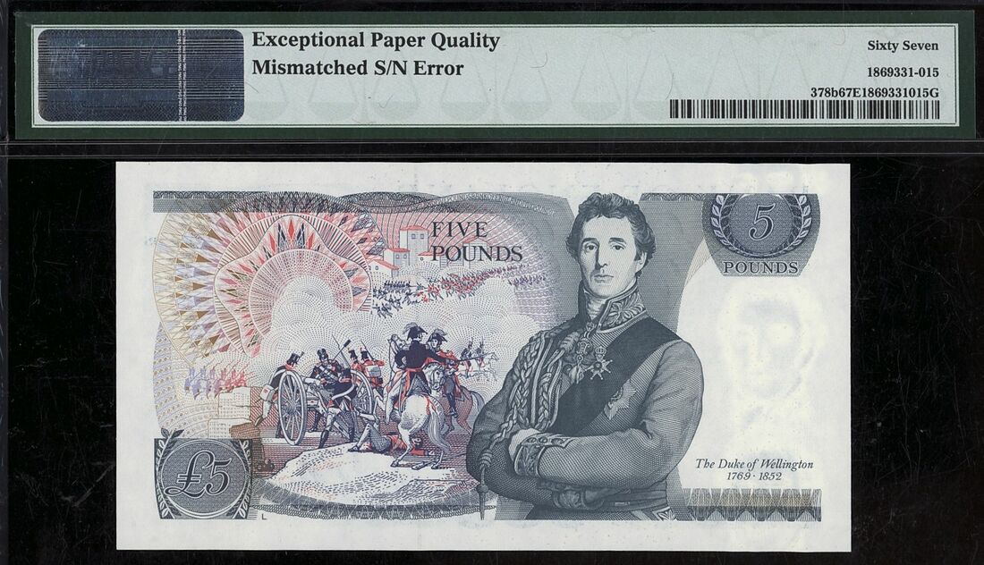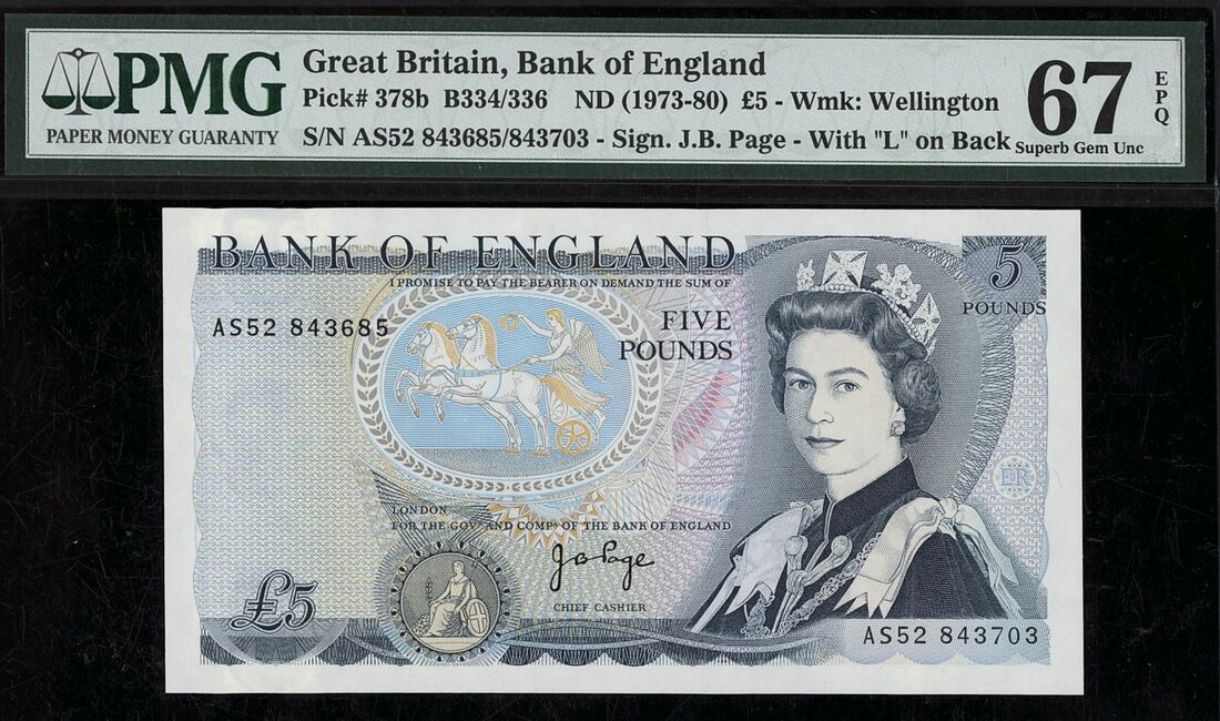 (x) Bank of England, £5, ND (1973-80), Mismatched serial number AS52 843685/843703, Page signature, (Pick 378b, EPM B334/336), in PMG holder 67 EPQ Superb Gem Uncirculated, only 5 notes in higher grades on PMG census