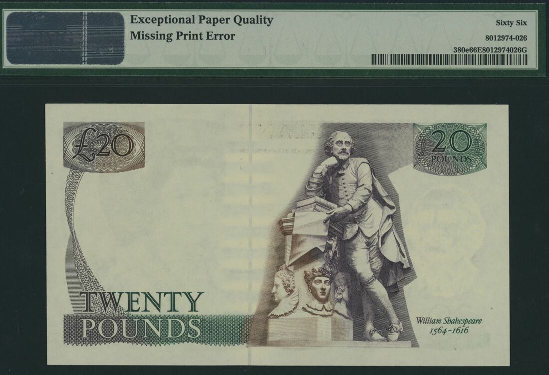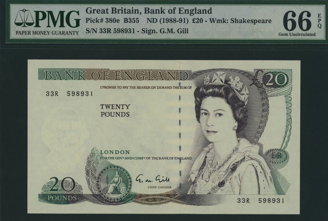 (x) Bank of England, £20, ND (1988-91), serial number 33R 598931, G.M. Gill signature, (Pick 380e, EPM B355), in PMG holder 66 EPQ Gem Uncirculated, missing print error