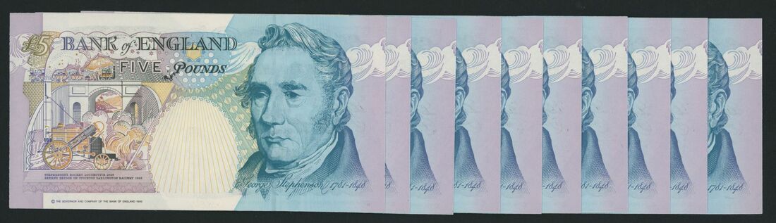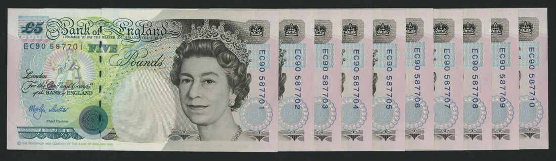(x) Bank of England, [10 notes] £5, 1990, consecutive serial numbers EC90 587701-10, Lowther signature, (EPM B380), about uncirculated (10 notes)
