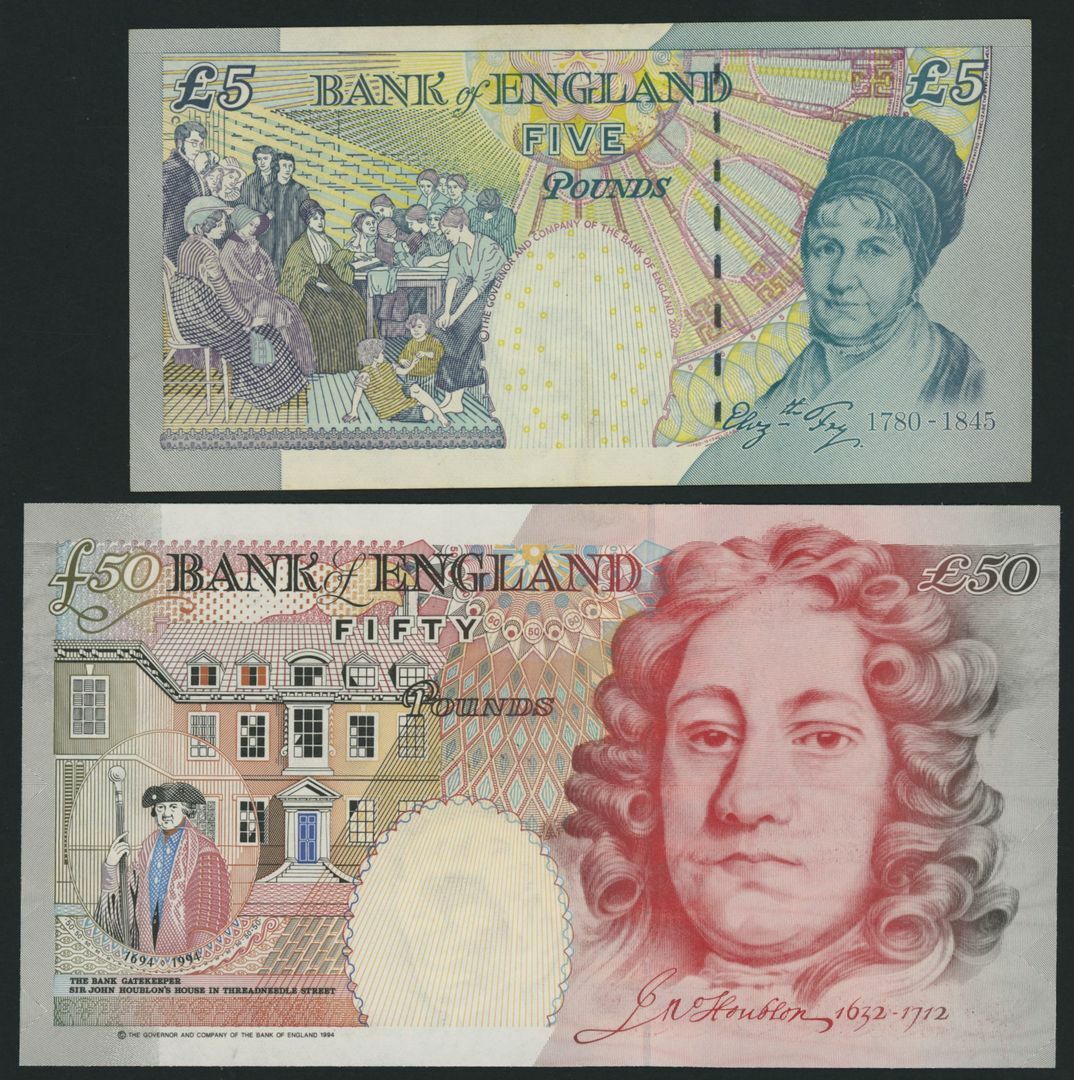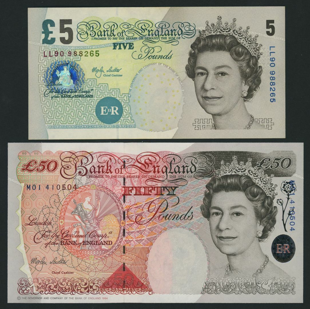 (x) Bank of England, [2 notes] £5, £50, 1999-2002, Lowther signature, [LAST RUN] £5, ND (2002), serial number LL90 988265;