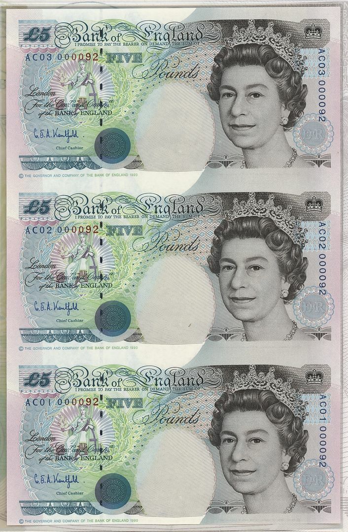 FIRST SHEETLET: uncut sheet of 3 £5, serial number AC01 000092;