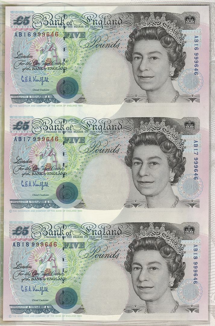 LAST SHEETLET: uncut sheet of 3 £5, serial number AB18 999646