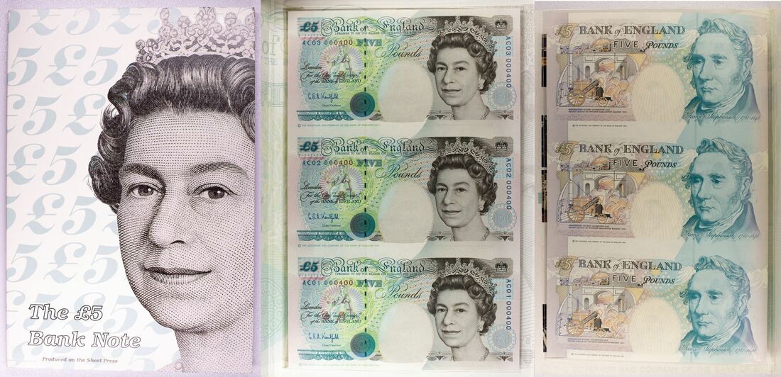 Bank of England, [3 notes] FIRST SHEETLET uncut sheet £5, 1993, serial numbers AC01, AC02 and AC03 0004000, Kentfield signature, (EPM C108), uncirculated, uncut sheet in presentational booklet (3 notes)