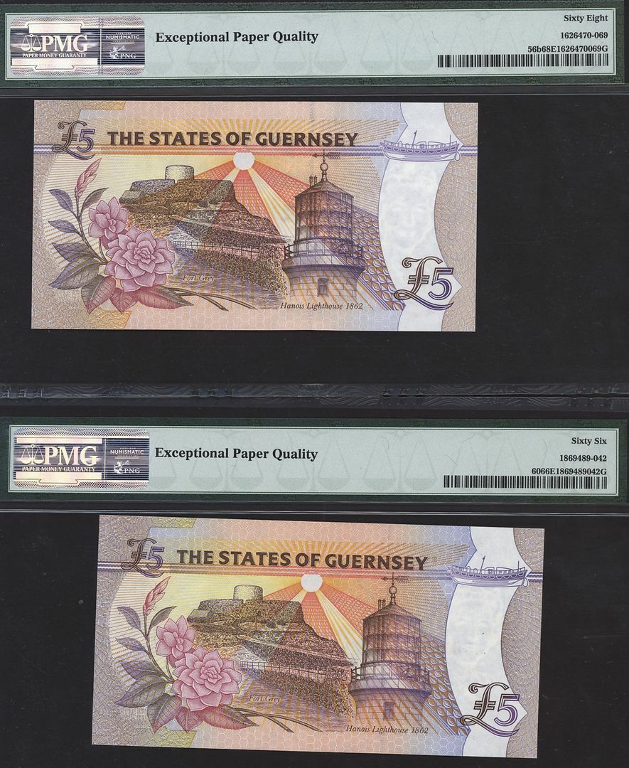 (x) The States of Guernsey, [2 notes] £5, 1996-2000, serial numbers D313069 and M234130, (Pick 56b, 60), in PMG holders 66 EPQ Gem Uncirculated and 68 EPQ Superb Gem Uncirculated (2 notes)