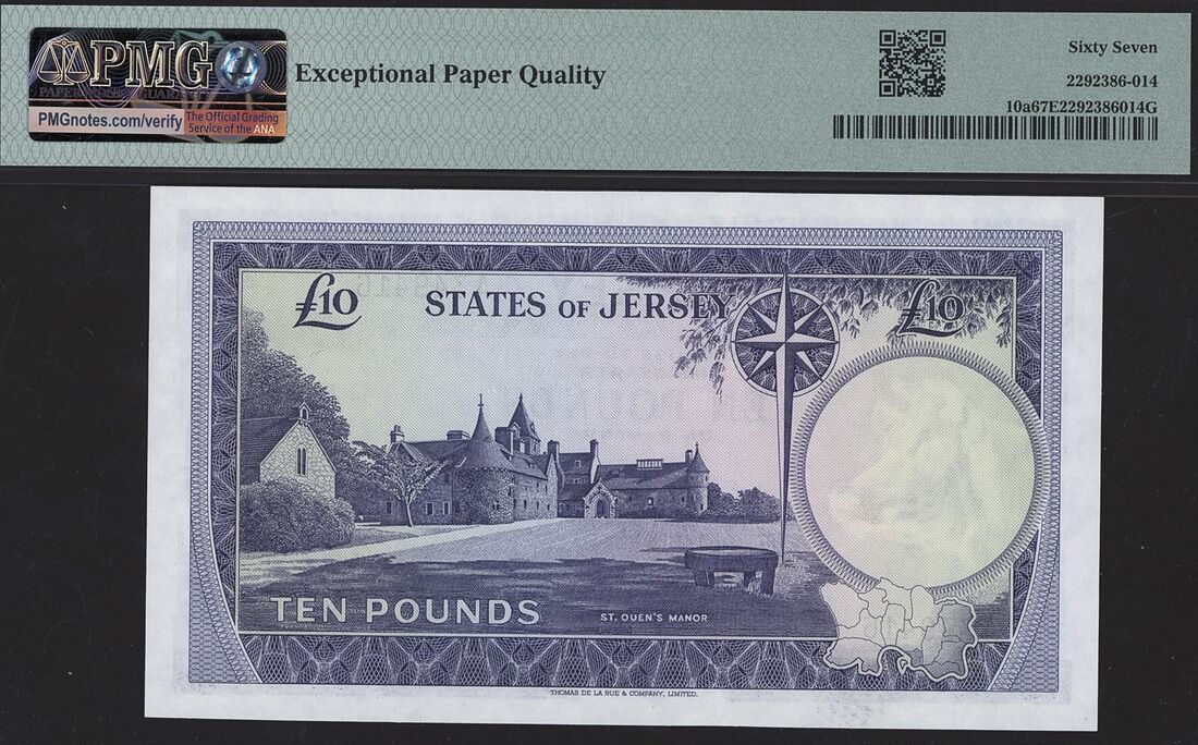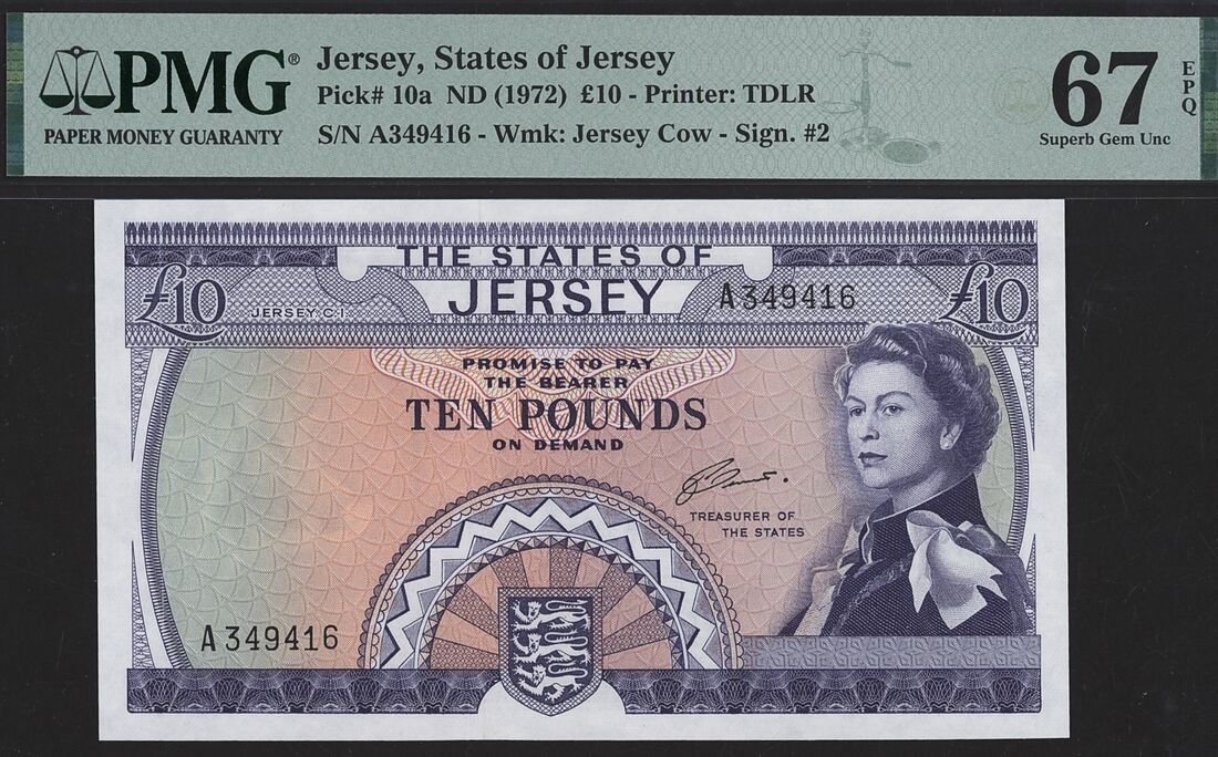 (x) States of Jersey, £10, ND (1972), serial number A349416, (Pick 10a), in PMG holder 67 EPQ Superb Gem Uncirculated