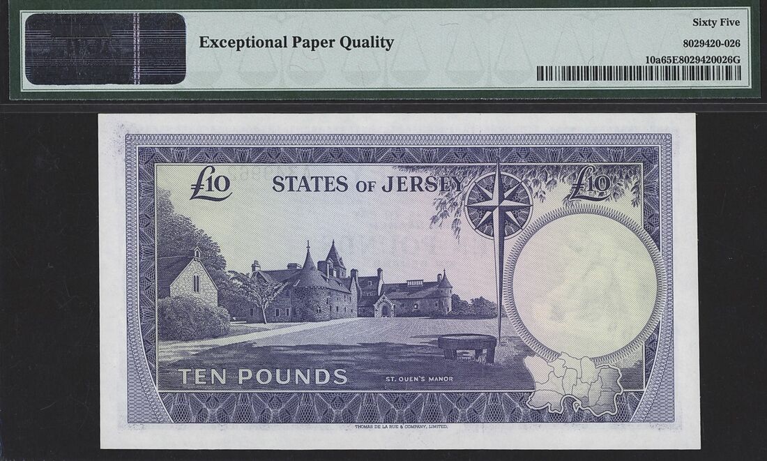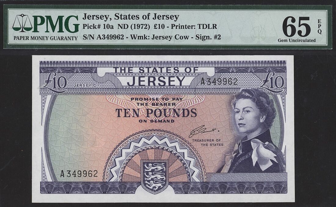 (x) States of Jersey, £10, ND (1972), serial number A349962, (Pick 10a), in PMG holder 65 EPQ Gem Uncirculated