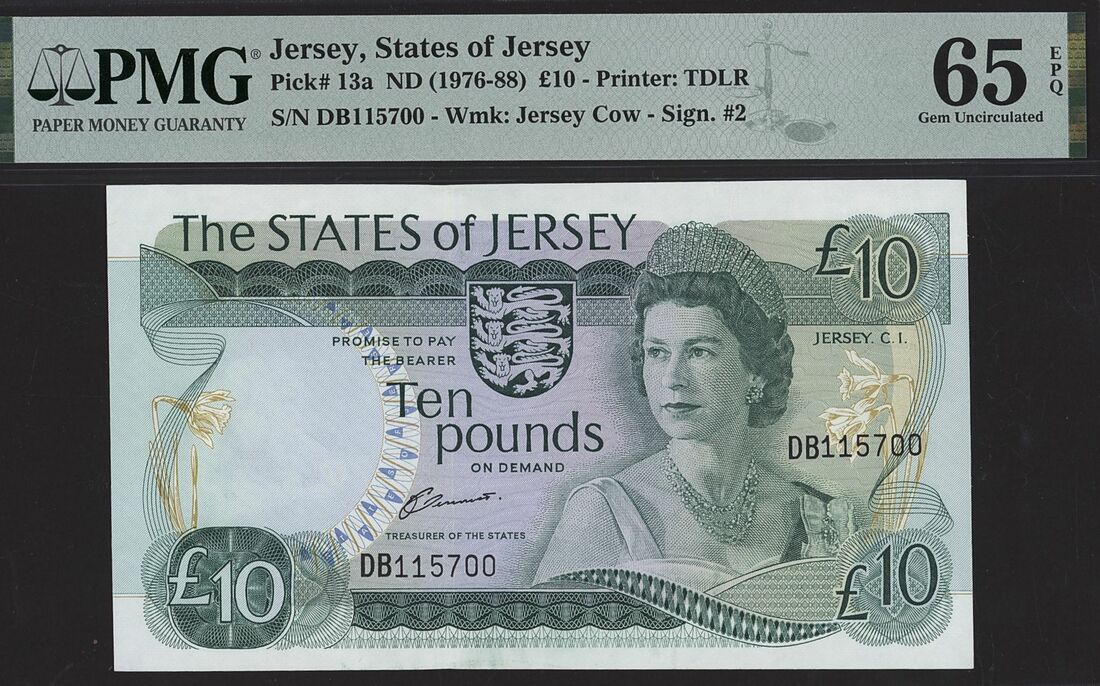 (x) The States of Jersey, £10, ND (1976-88), serial number DB115700, (Pick 13a), in PMG holder 65 EPQ Gem Uncirculated