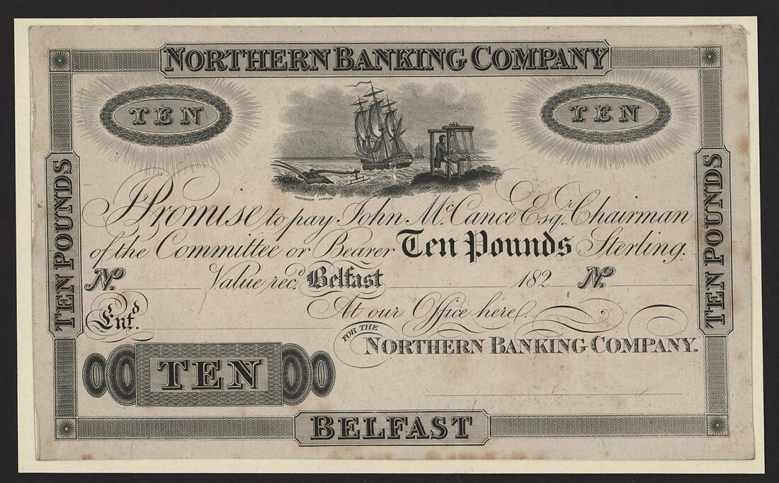 Northern Banking Company, obverse proof £10, Belfast, 182x, (PMI NR 13), stains, foxing, some wear to corners otherwise about very fine, mounted on card