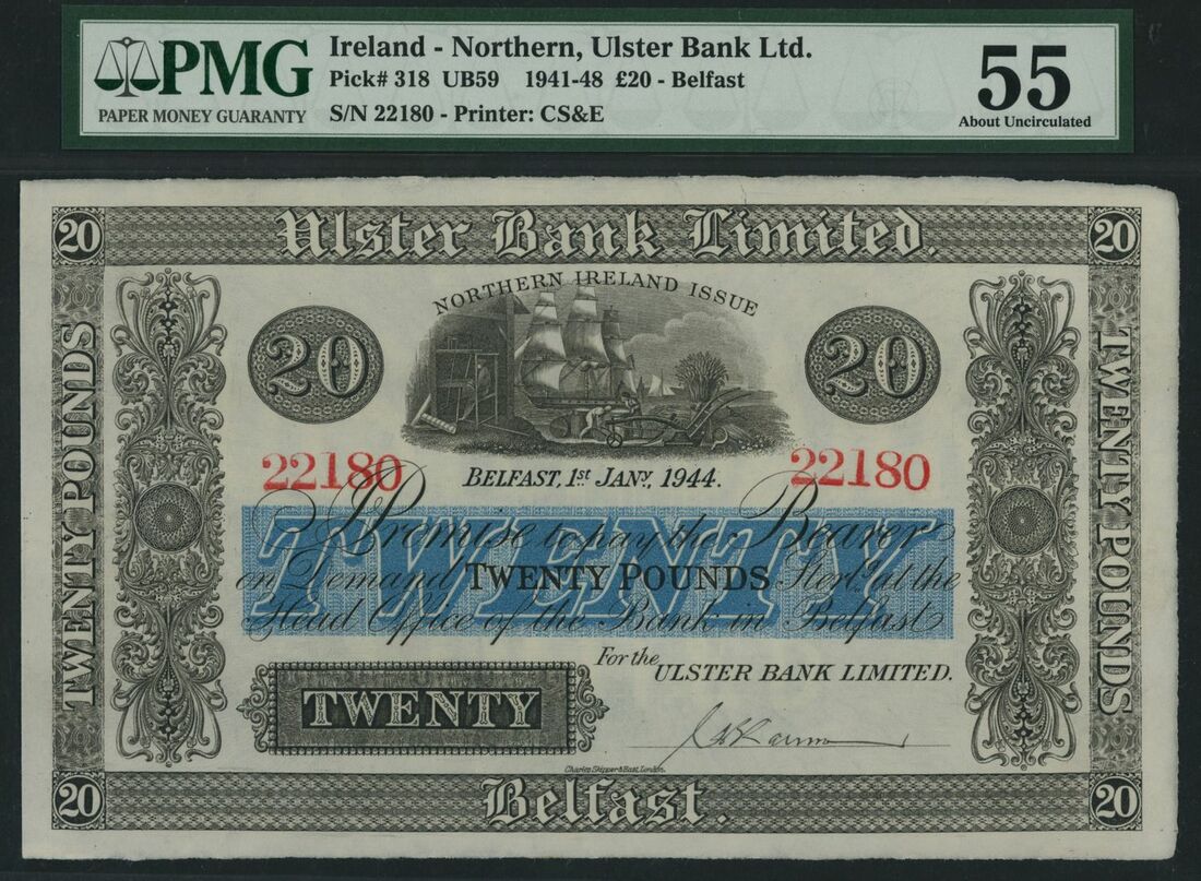 (x) Ulster Bank Ltd., Northern Ireland, £20, Belfast, 1st January 1944, serial number 22180, (Pick 318, UB59), in PMG holder 55 About Uncirculated, only 2 notes graded higher on PMG census