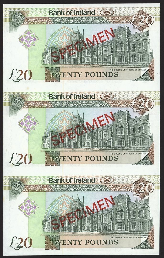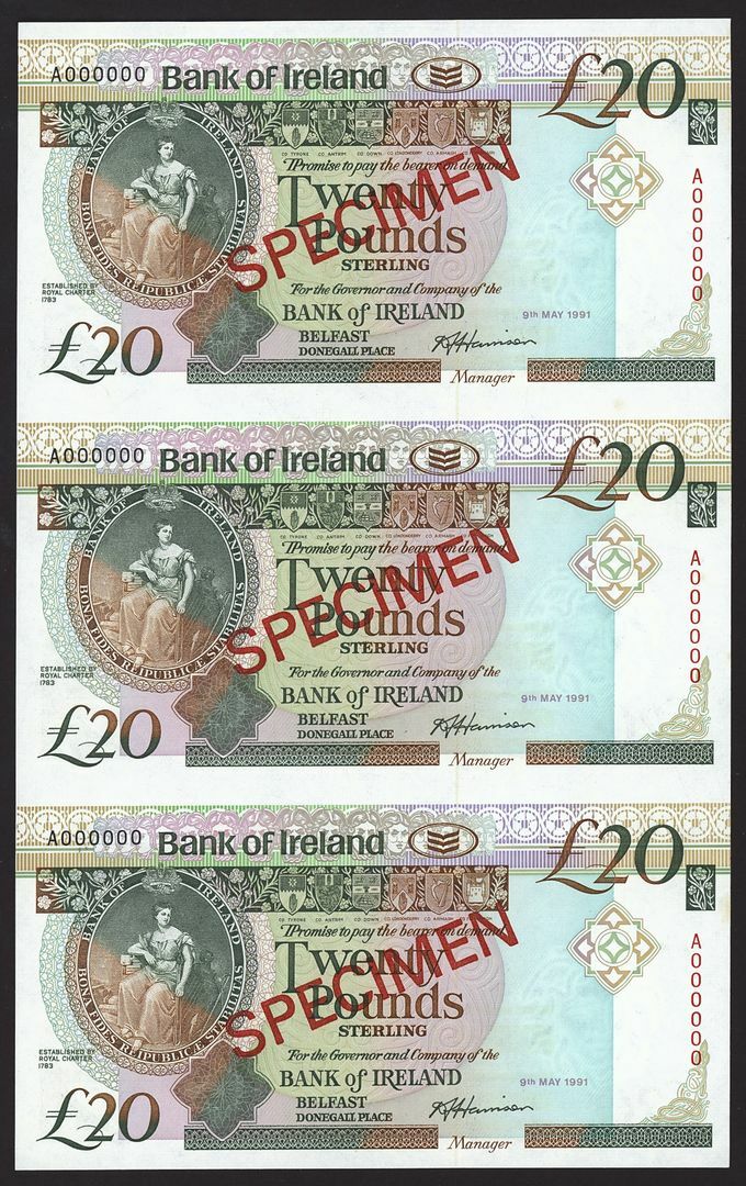 (x) Bank of Ireland, uncut sheet of 3 specimen notes, £20, Belfast, 9th May 1991, serial number A000000, (Pick 72a, BA 129), about uncirculated, a few handling creases due to size