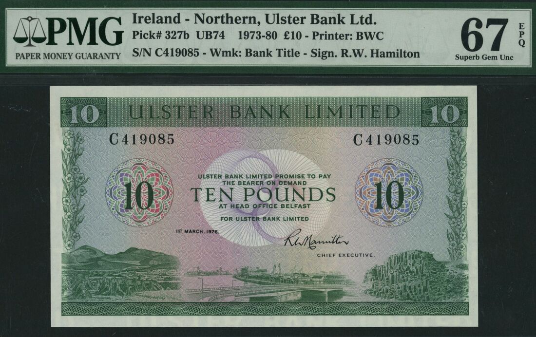 (x) Ulster Bank Ltd., Northern Ireland, [Top Pop] £10, 1st March 1976, serial number C419085, (Pick 327b, UB74), in PMG holder 67 EPQ Superb Gem Uncirculated, single finest graded on PMG census
