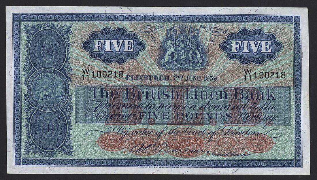 £5 (2): 16th July 1943, serial number H/7 5/150; 3rd June 1959, serial number W/11 100218;