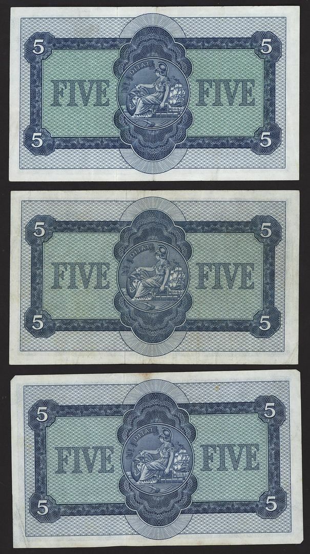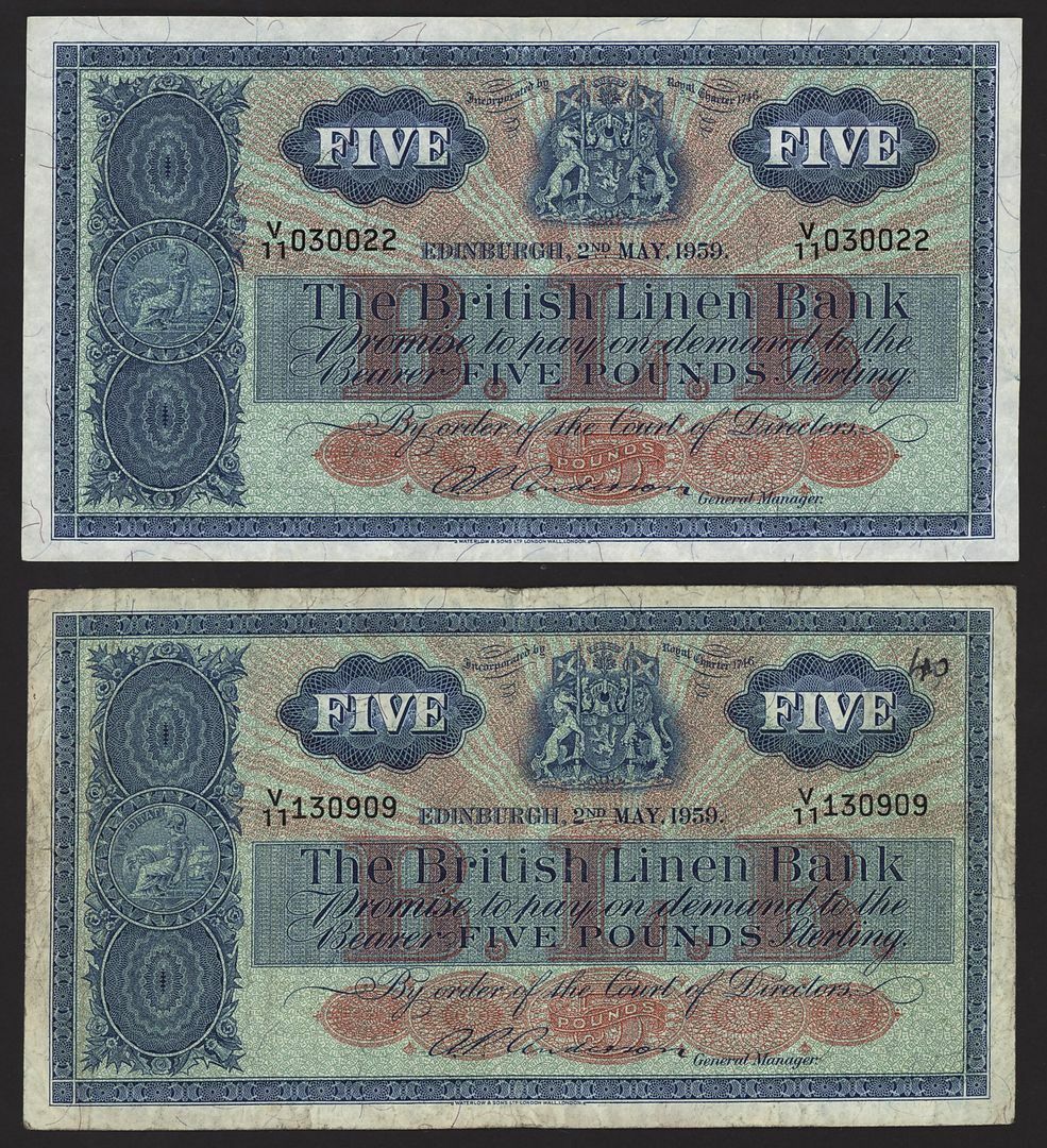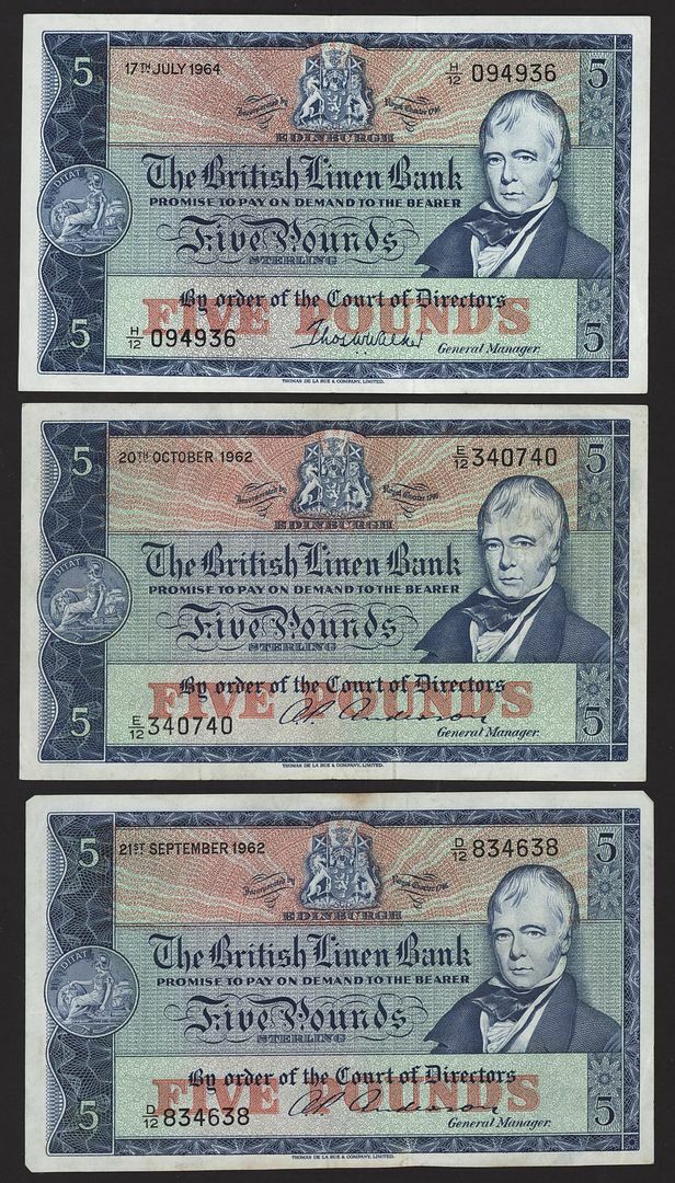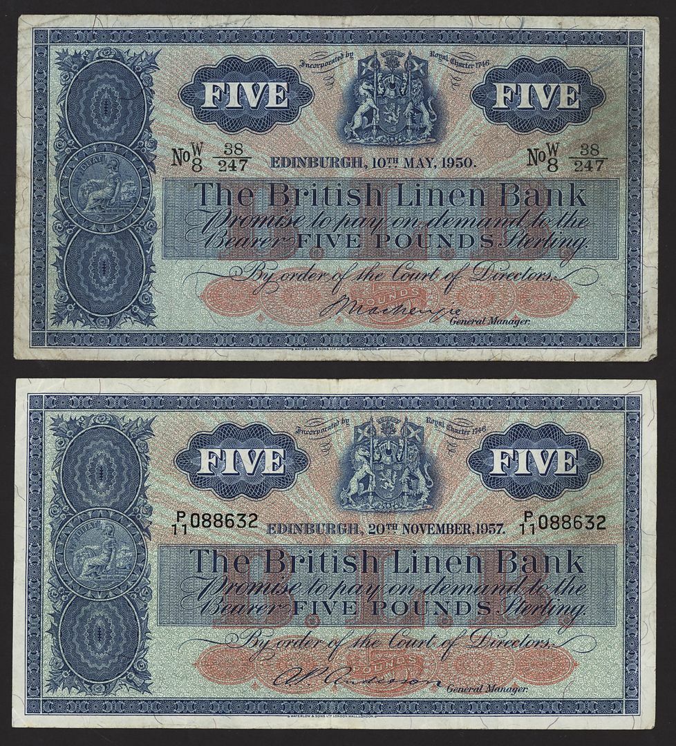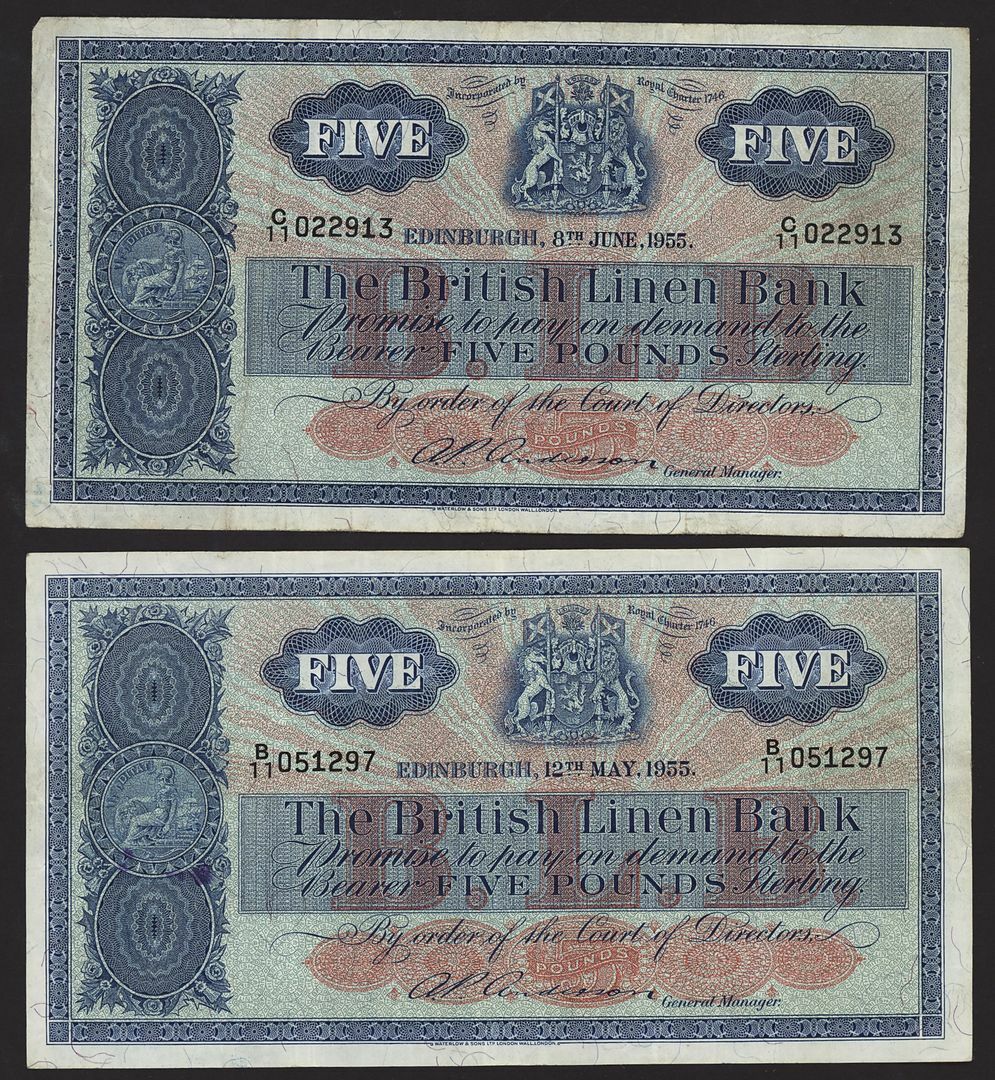 British Linen Bank, Scotland, [9 notes] £5, Edinburgh, 1950-1964, serial numbers W/8 38/247, B/11 051297, C/11 022913, P/11 088632, V/11 030022, V/11 130909, D/12 834638, E/12 340740 and H/12 094936