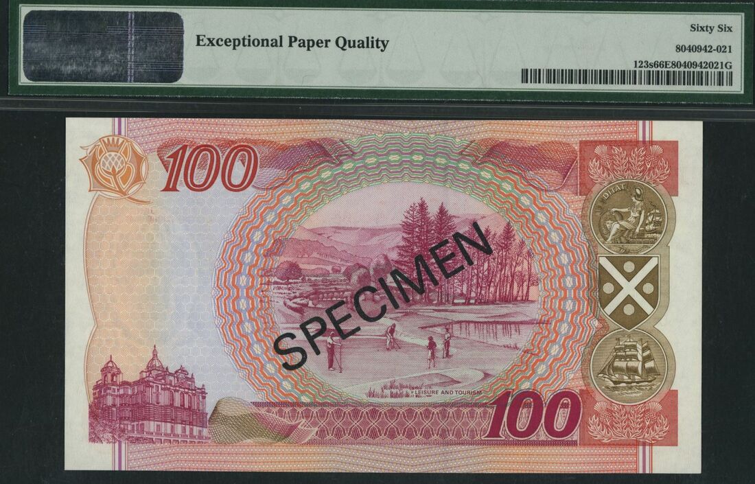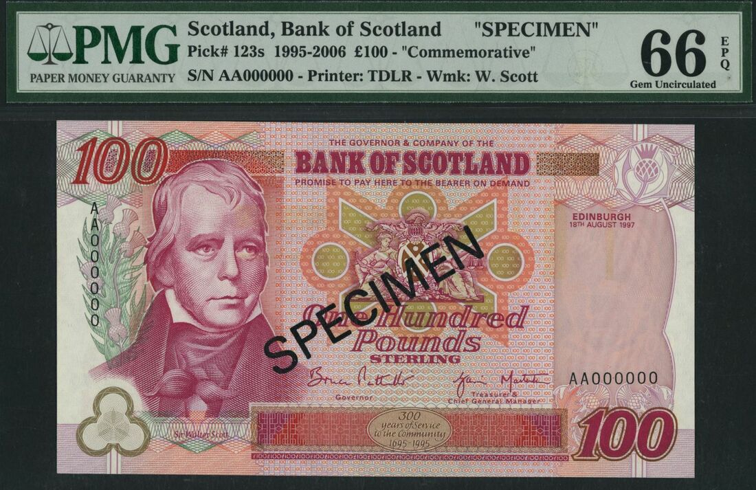 (x) Bank of Scotland, specimen £100, 18th August 1997, serial number AA000000, commemorative issue, (Pick 123bs), in PMG holder 66 EPQ Gem Uncirculated