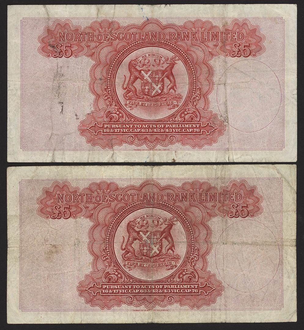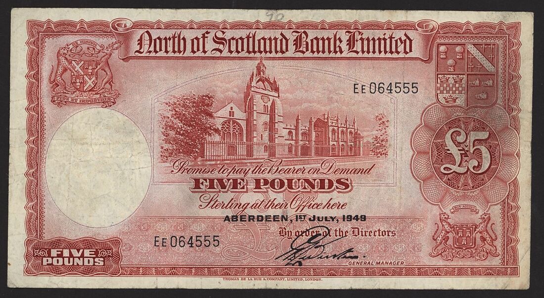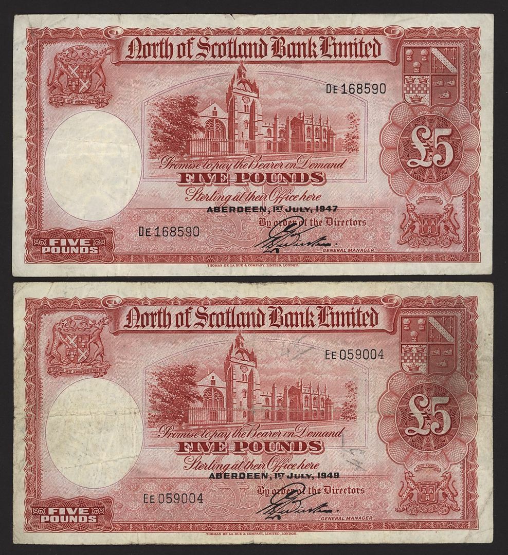 North of Scotland Bank Limited, [3 notes] £5, Aberdeen, 1st July 1947-1949, serial numbers DE168590, EE059004 and EE064555