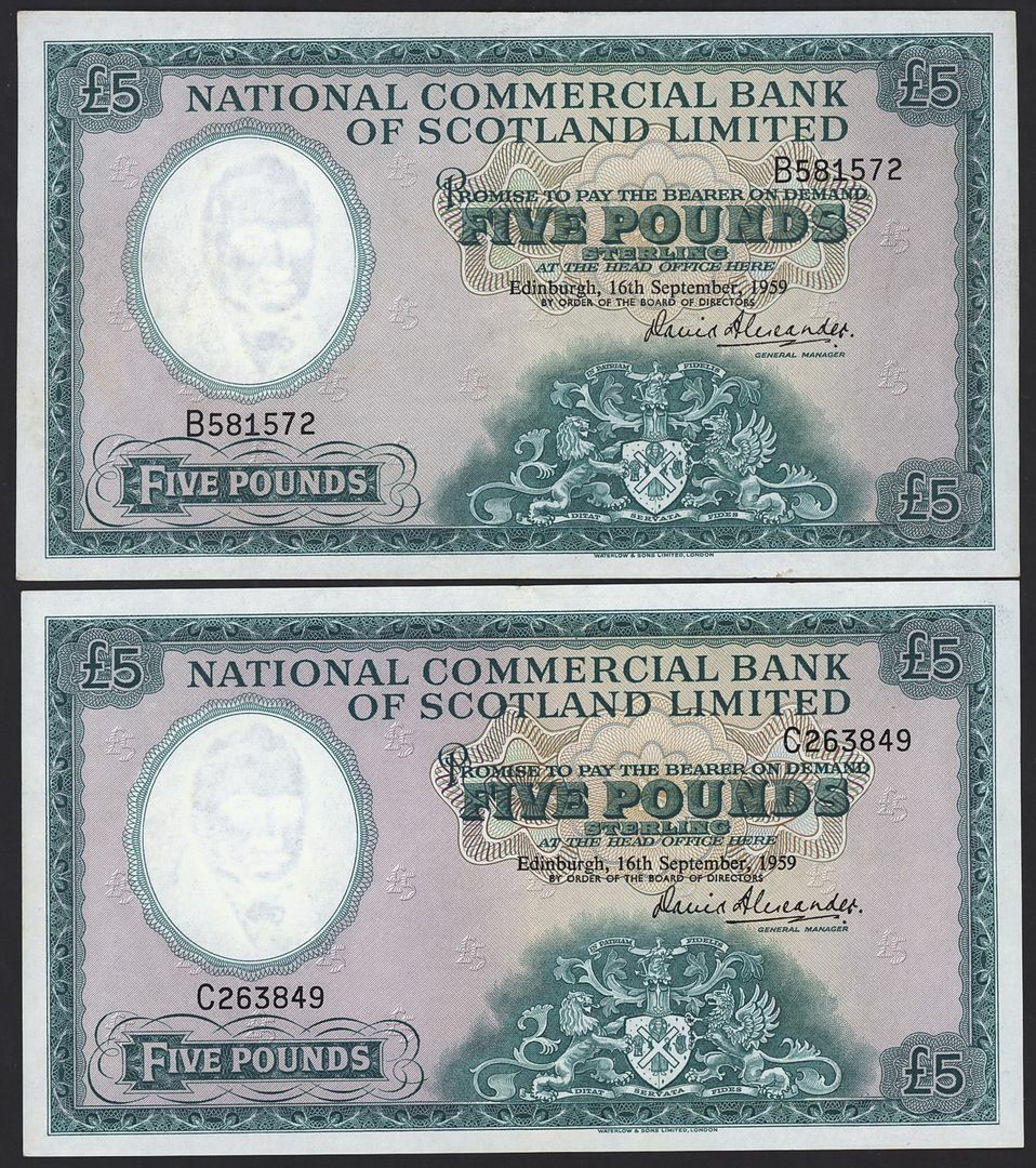 National Commercial Bank of Scotland Ltd.: 16th September 1959 (4), serial numbers A711736, B581572, C263849 and D382116;