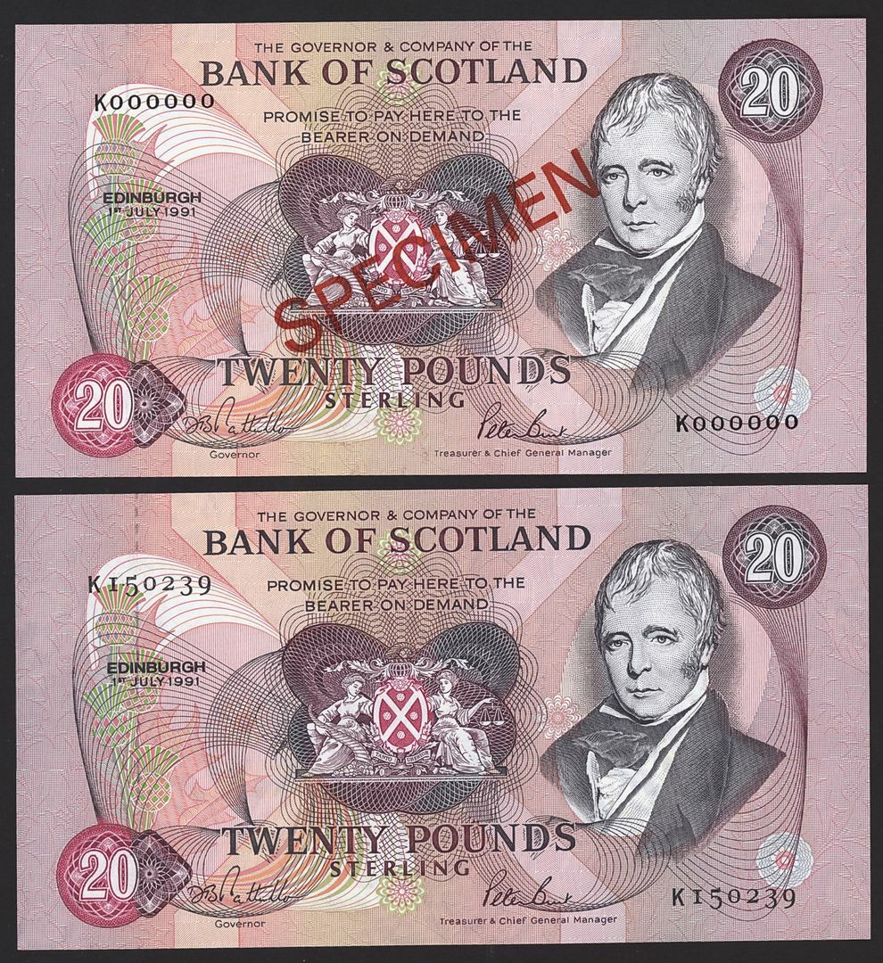 Bank of Scotland, [2 notes] specimen £20, £20, Edinburgh, 1st July 1991, serial numbers K000000 and K150239, (PMS BA 119), uncirculated (2 notes)